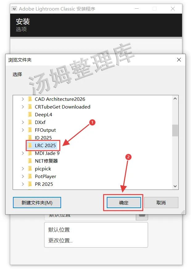 5.选择安装路径,例如可以在D盘新建一个命名为【LRC 2025】的文件夹,选中后点击【确定】。