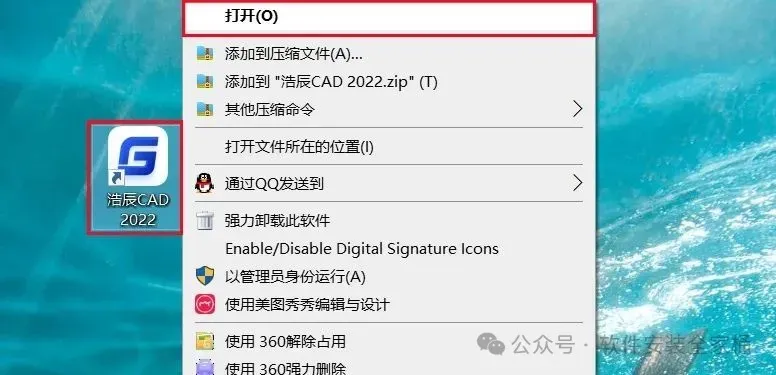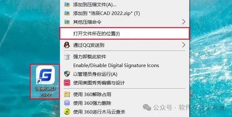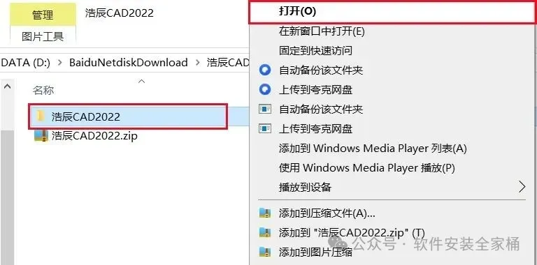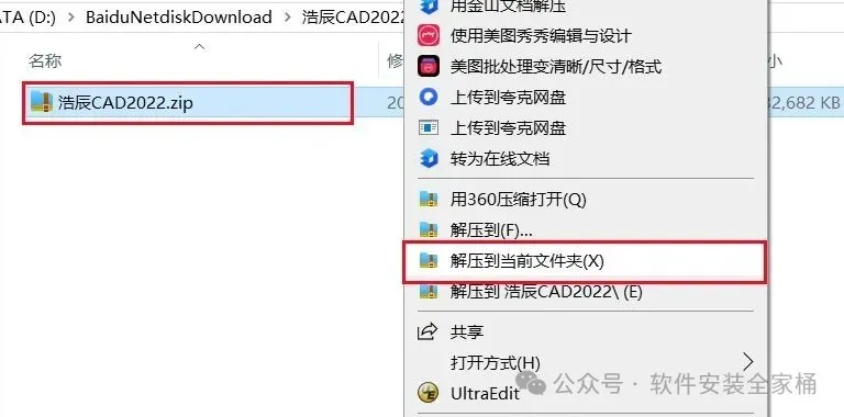 1.打开下载的浩辰CAD软件安装包,鼠标右击压缩包选择【解压到当前文件夹】。