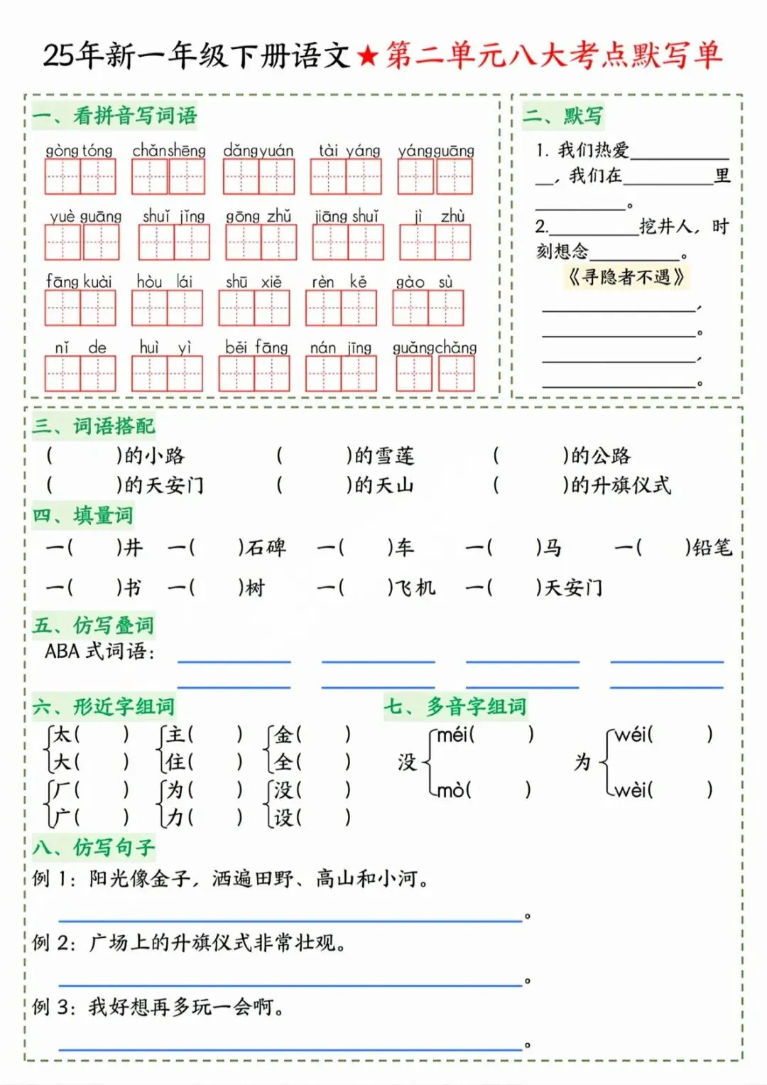【免费下载】一年级下语文八大考点默写单,PDF电子版,共8页,可打印