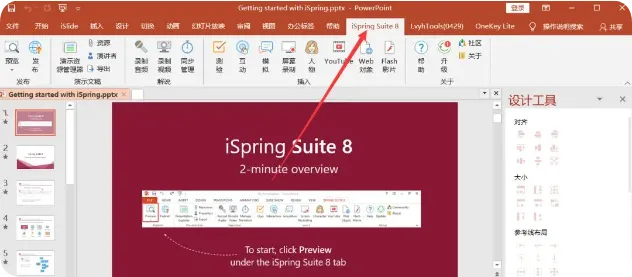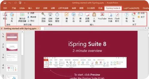 重新启动PowerPoint,在界面顶部会自动显示专门的iSpring Suite功能区