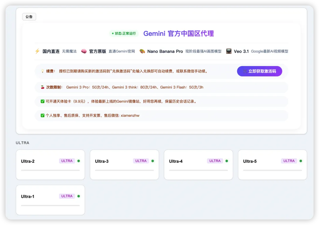✅ 界面:Gemini官网的 1:1 完美复刻。(后台是Gemini 200美金/月的Ultra和20美金/月的pro会员。)