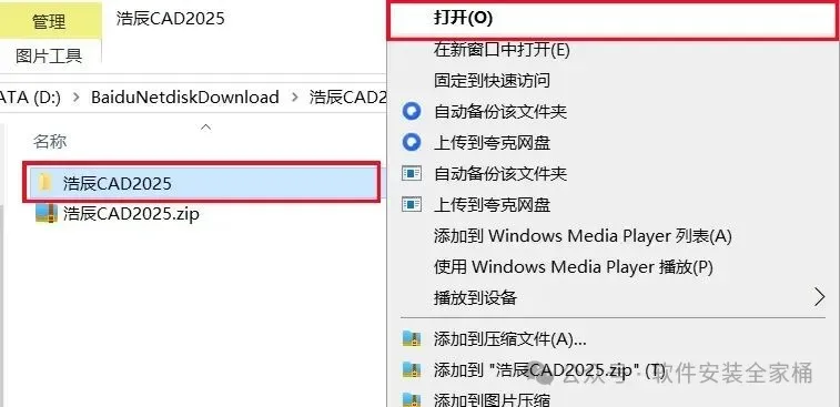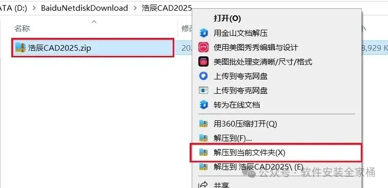 1.打开下载的浩辰CAD软件安装包,鼠标右击压缩包选择【解压到当前文件夹】。