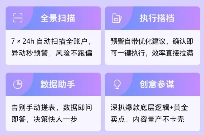 腾讯广告于本年度推出AI助理功能,AI助理定位为“王牌队友”,其核心机制是“洞察+执行”双重赋能,能够为服务商的账户管理、数据分析与创意提效提供全方位支持。在提效层面,AI助理可自动监测账户异常并生成处理方案,实现从发现问题到解决问题的闭环;在数据层面,支持通过自然语言指令快速获取清晰数据洞察,提升决策速度;在创意层面,可深度分析爆款素材,提炼核心卖点与逻辑,激发创作灵感。通过将智能诊断、数据查询与创意生成深度整合,协助服务商构建“智能监测-数据驱动-创意优化”的高效经营工作流。