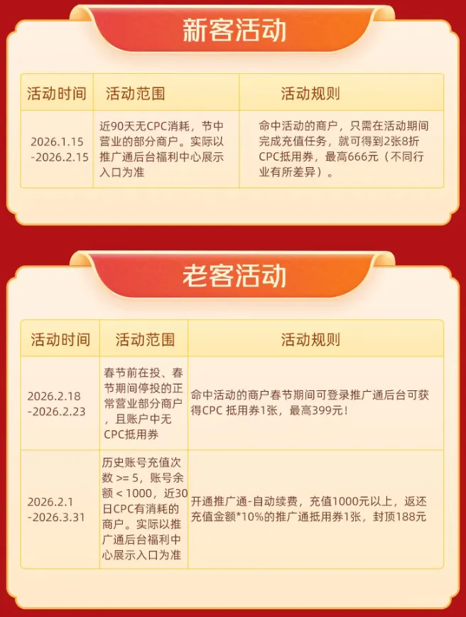 美团发布“2026年春节不打烊乐生活商业流量加油包”活动,聚焦春节消费黄金节点助力商户抢流量、促生意。春节三大热点场景分析行业分别是返乡团聚带火三四线城市K歌、棋牌,异地过年催热洗浴、按摩足疗,“新年新形象”推动节前美发、美甲等丽人服务需求。商家可进行套餐分层设计、强化节日营销、精准广告投放等。同时,美团官方也重点推出含“新客活动”“老客活动”“消耗有好礼”的流量激励包,助力商家实现春节生意开门红。