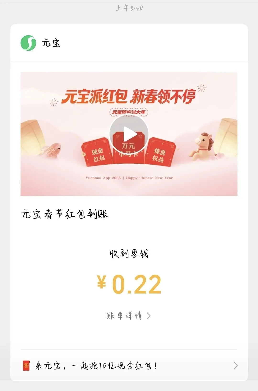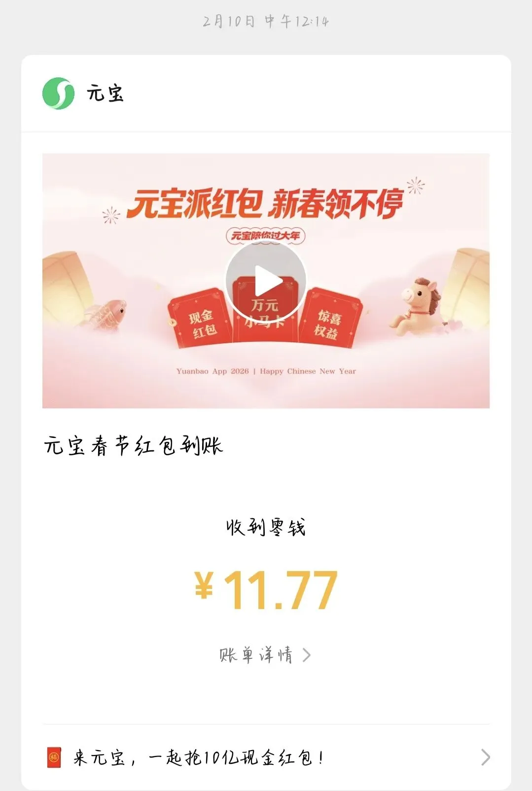 总体上感觉腾讯元宝瓜分10亿的红包活动要落幕了,现在还能参与的就是通过抽奖次数抽小额红包、领元宝派里的红包,今天的祝福口令红包。
