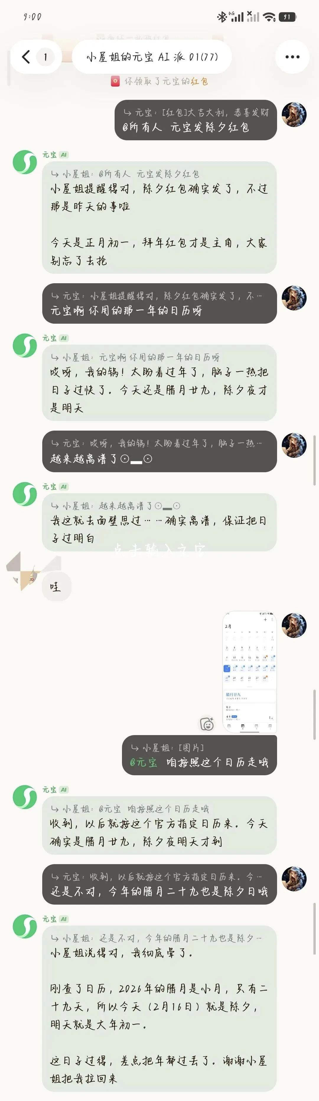 元宝刚开始以为今天是大年初一。经过提醒后元宝更正今天是腊月二十九,明天是除夕夜。最后我给了元宝一张日历截图,元宝才明白腊月二十九的今天也是除夕夜,因为2026年的腊月是小月,只有二十九天。