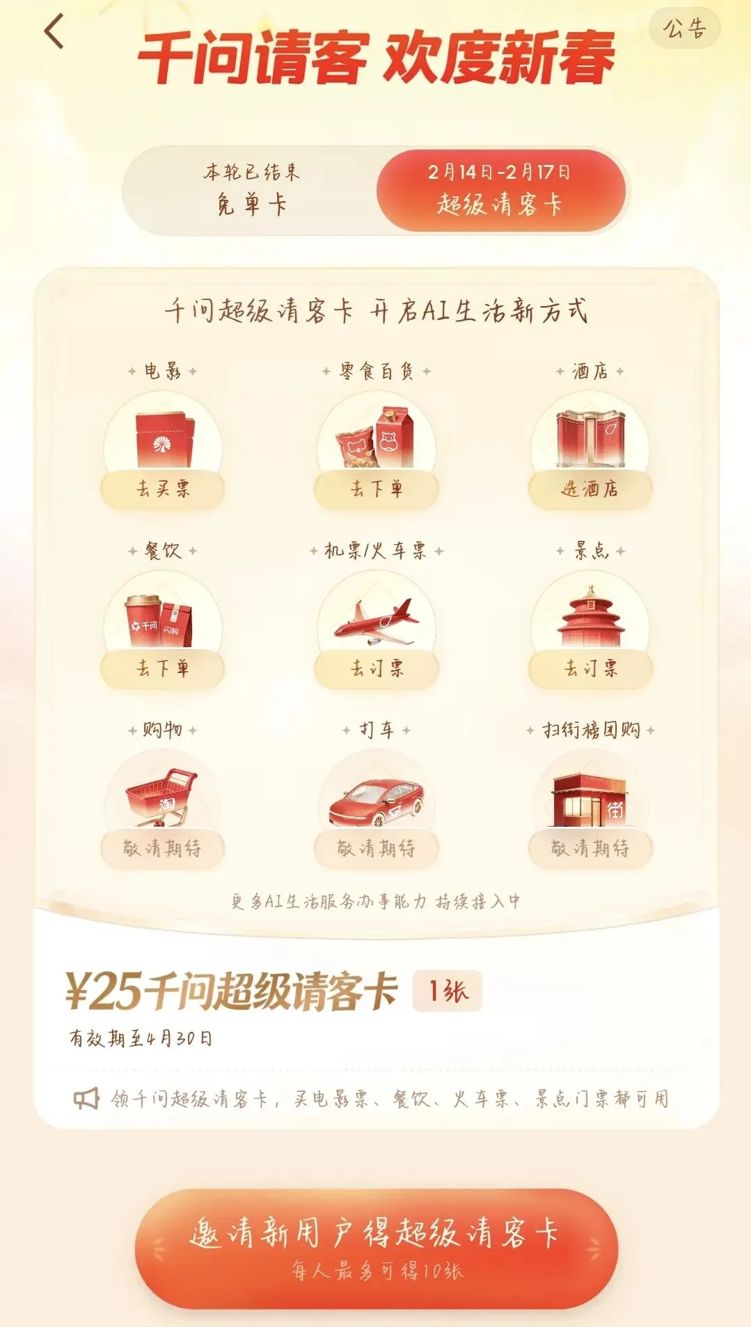 现在进行的是2月14日—2月17日的25元超级请客卡。