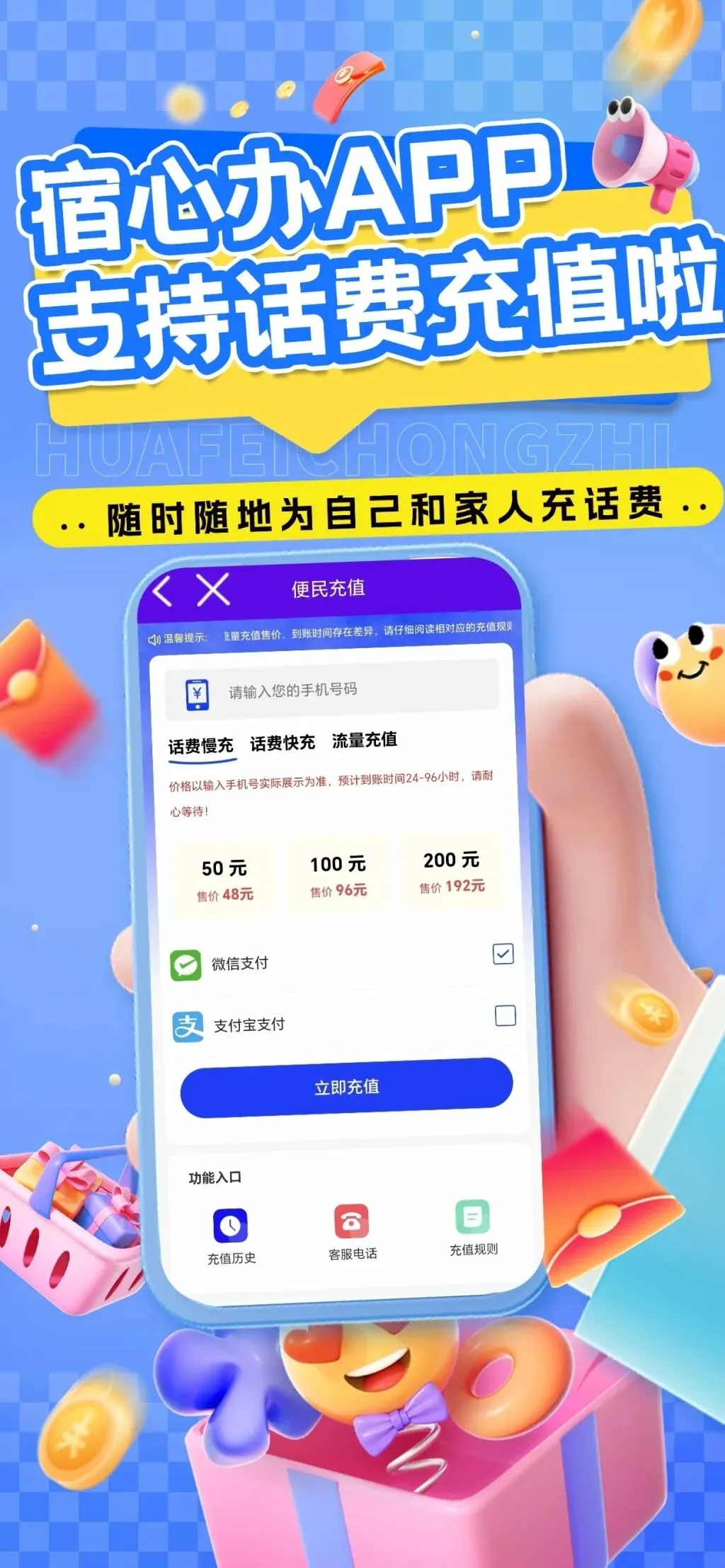 现在使用宿心办APP进行话费充值,最高可享96折优惠,具体优惠以页面实际为准~花更少的钱,给手机“加油”,这羊毛不薅可就亏大啦!