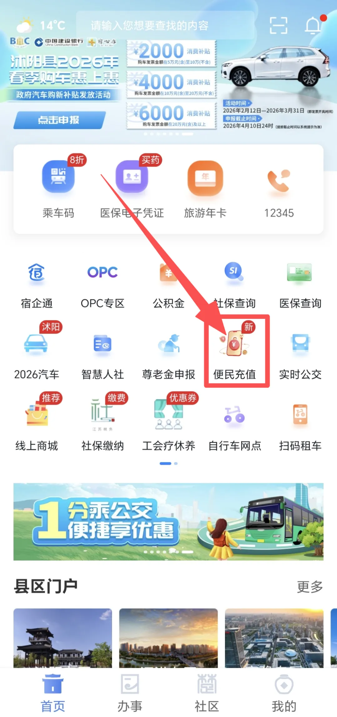 手机应用商店下载宿心办APP,注册登录并完成实名认证, 首页找到「便民充值」入口,一秒进入充值页面!