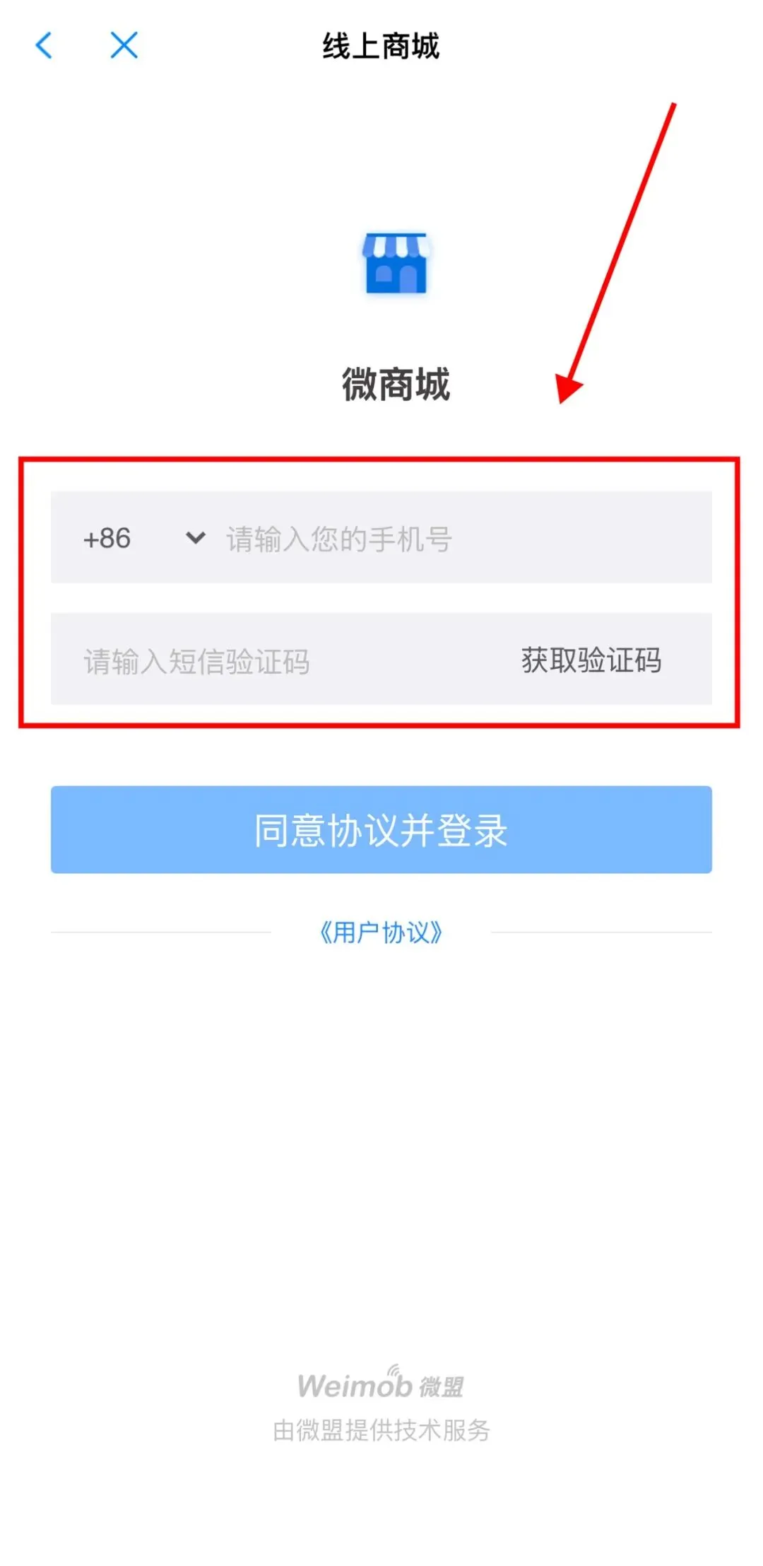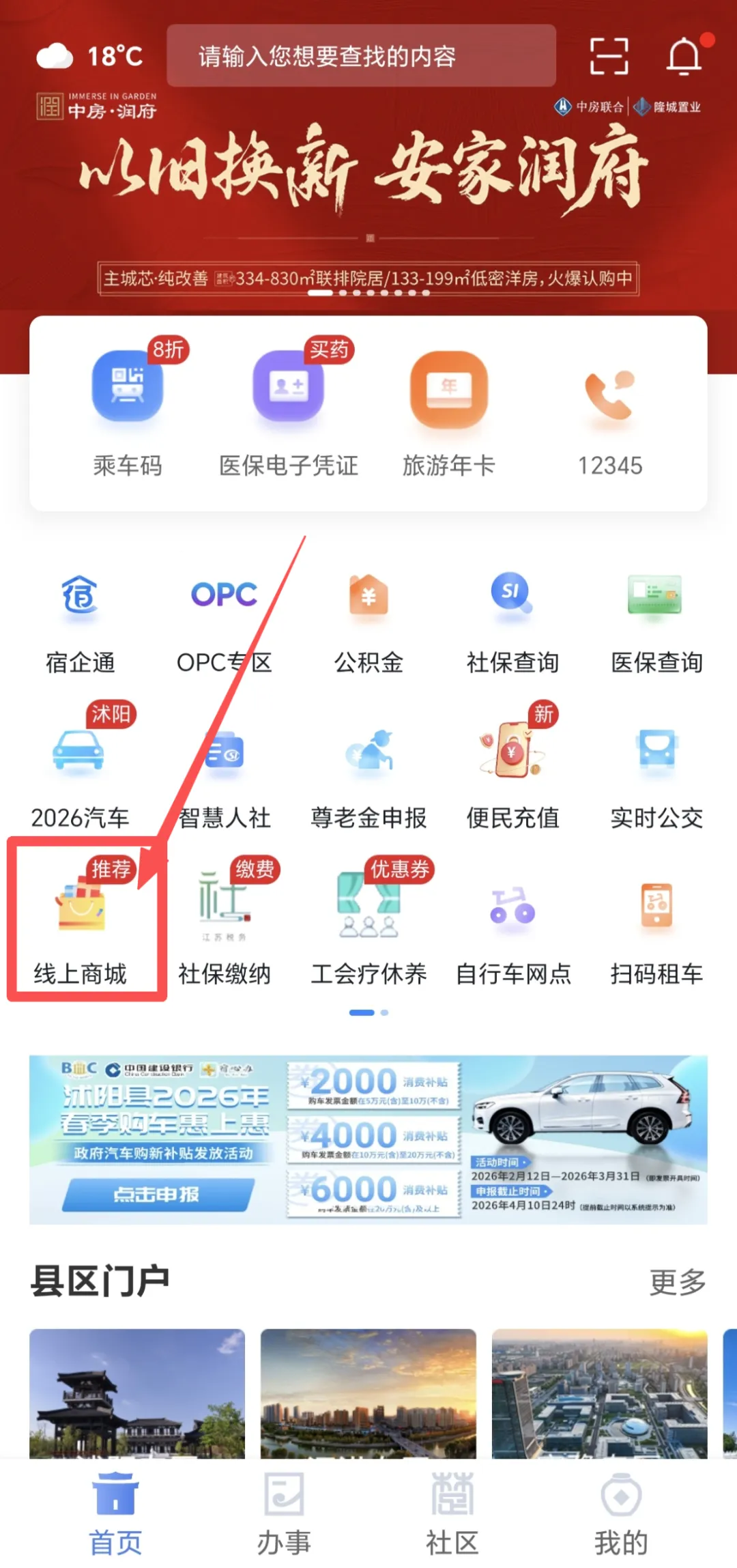 应用商店下载宿心办APP,注册登录并完成实名认证, 首页推荐服务选择「线上商城」入口,输入手机号和验证码进入微商城详情页面。