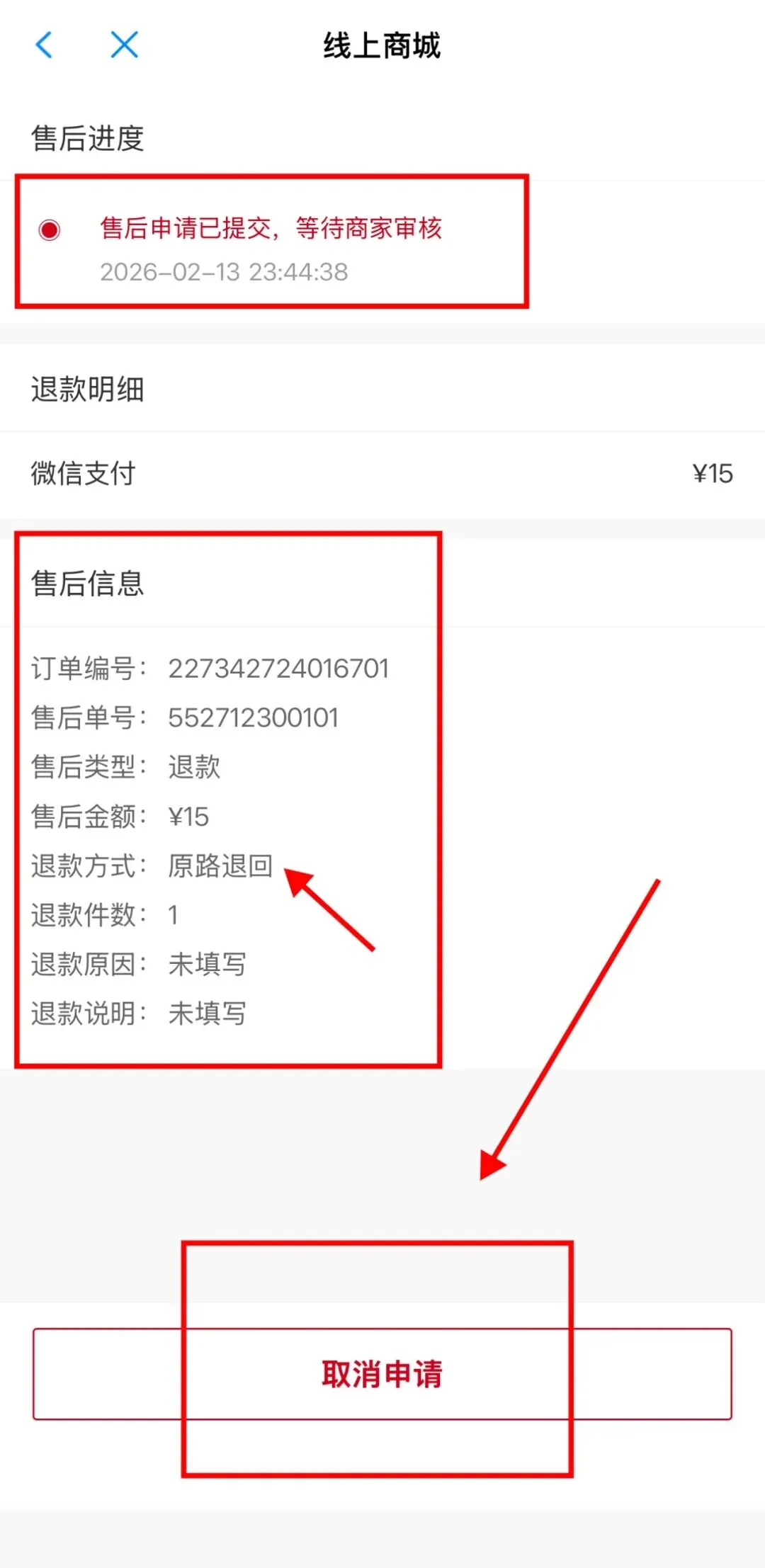 提交申请后用户可查看售后进度或选择【取消申请】,取消申请后,用户可点击页面底部选择【再次申请】重新发起售后申请。