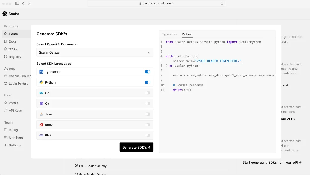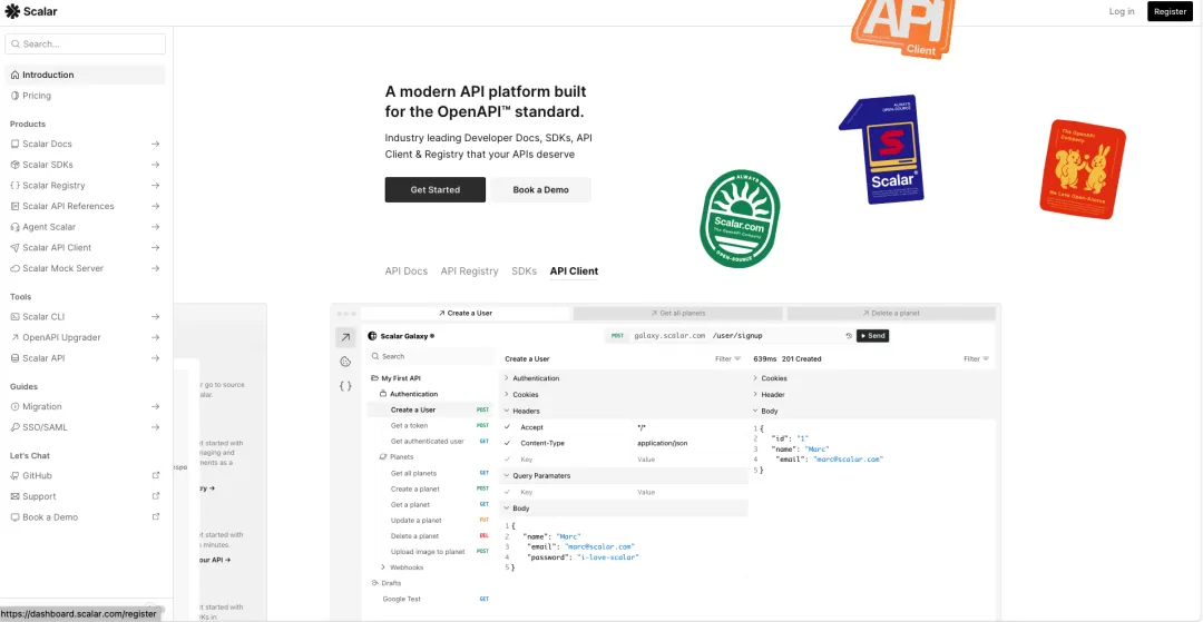 Scalar 是一个开源的 API 平台,致力于打造“开发者友好”的 API 文档和客户端工具。它既可以作为 Swagger/OpenAPI 文档的渲染界面,也能作为 API 测试工具(类似 Postman),还内置 Mock Server、SDK 生成器、OpenAPI 编辑器等功能,一站式搞定文档管理。