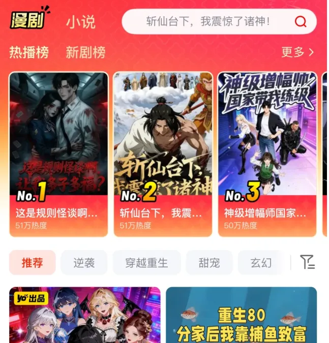 宣传语简洁直接:“热门漫剧,尽在红果”,定位清晰,主打短剧 + 漫剧双内容形态。