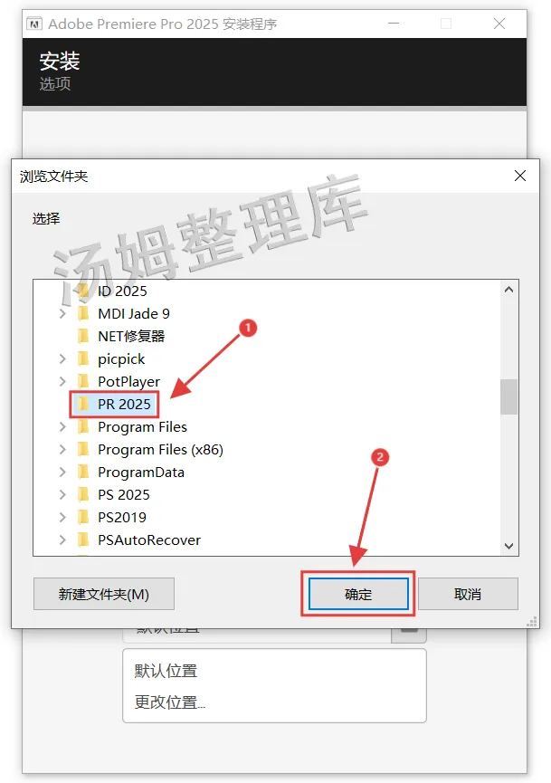 5.选择安装路径,例如可以在D盘新建一个命名为【PR 2025】的文件夹,选中后点击【确定】。