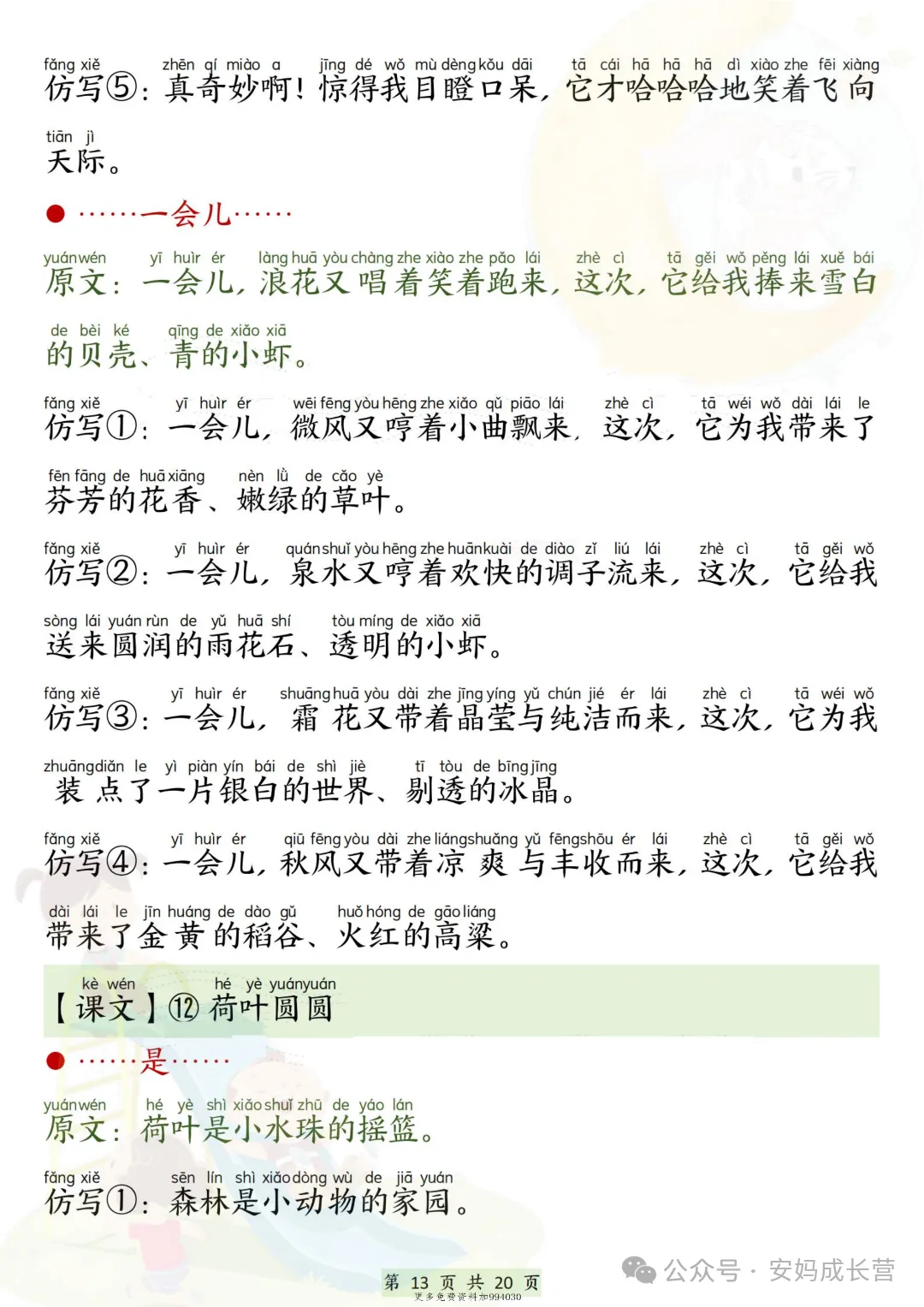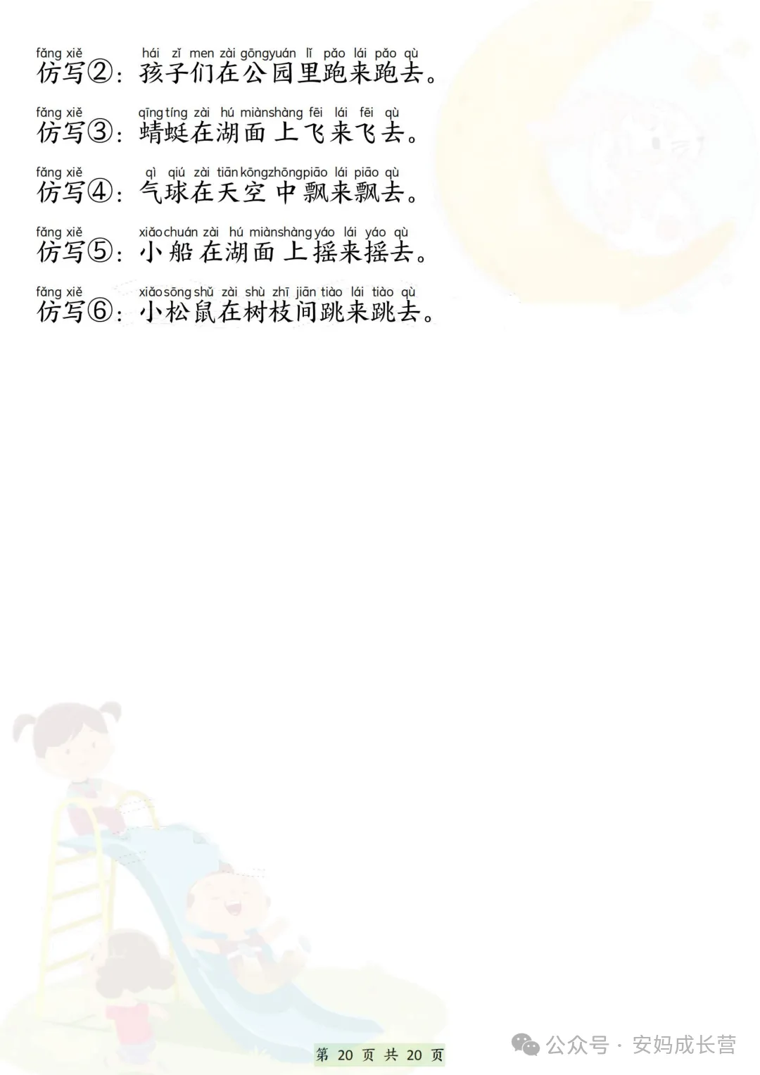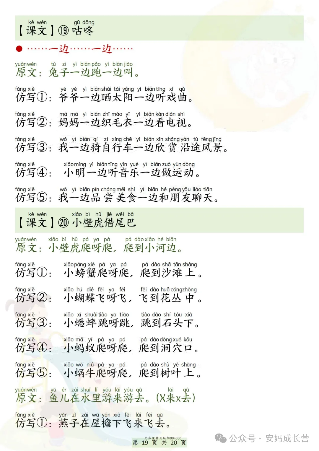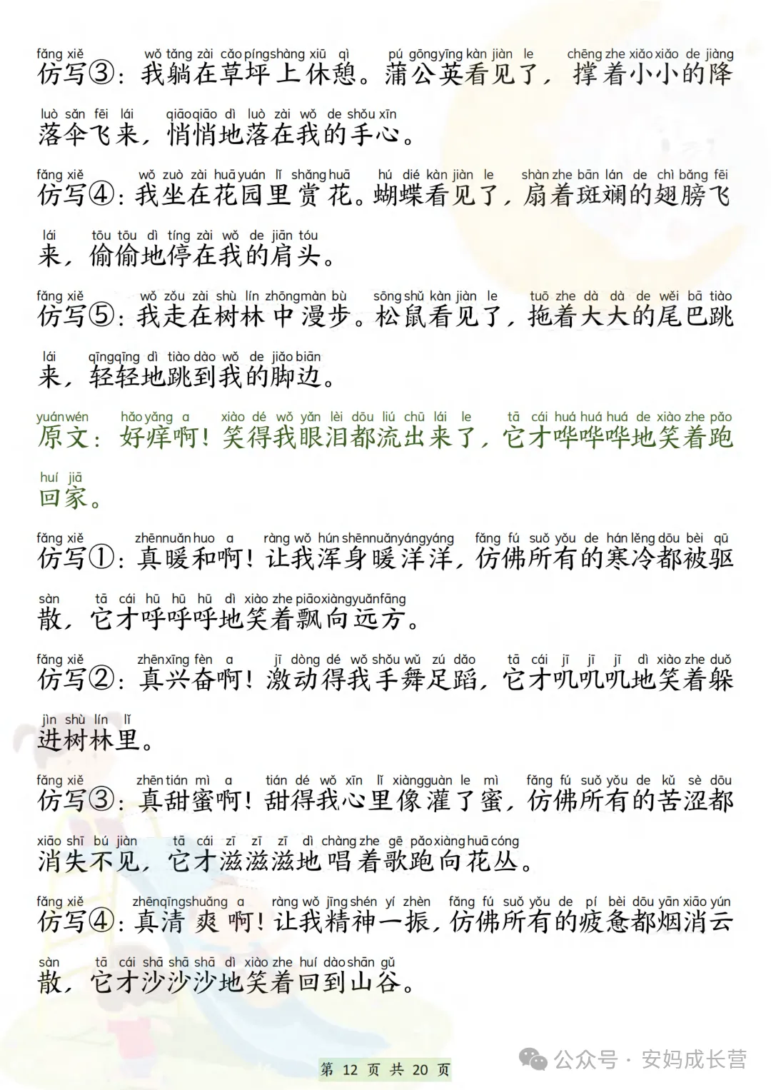 26年人教版一年级下册语文《每课仿写句子汇总》,共20页,电子版可下载可打印,这份一下语文仿写句子,涵盖了每篇课文的仿写例句,通过这些优秀的仿照例句,帮助孩子掌握各种句式结构,积累丰富的写作素材,提升孩子的语言表达能力。需要的家长抓紧给孩子准备上一份,让孩子背一背吧。