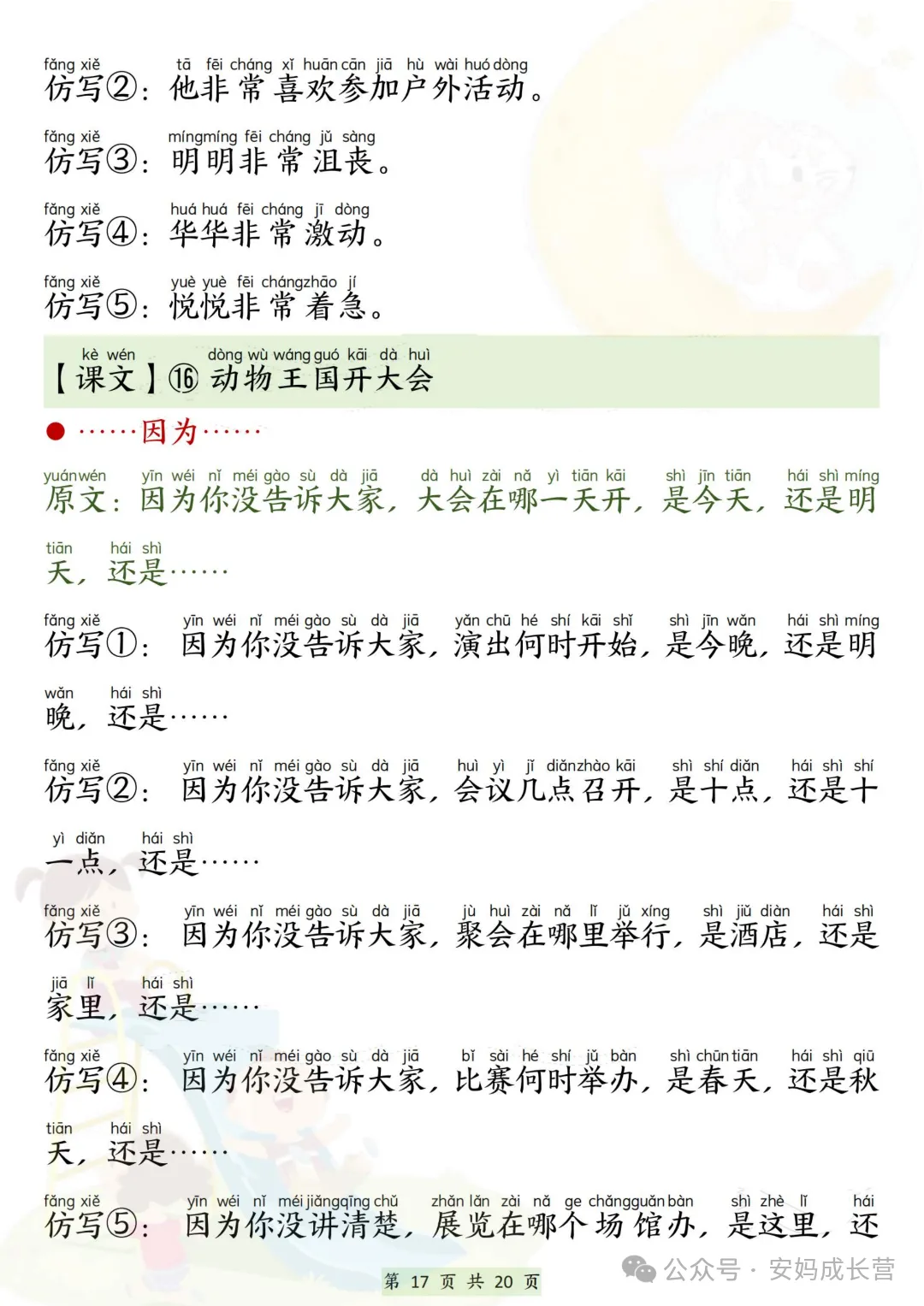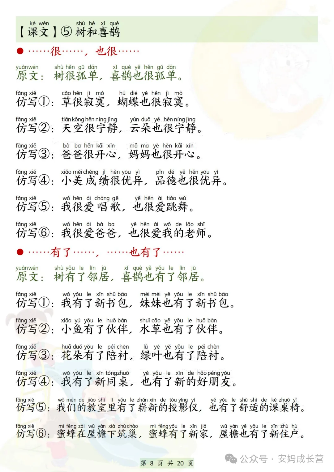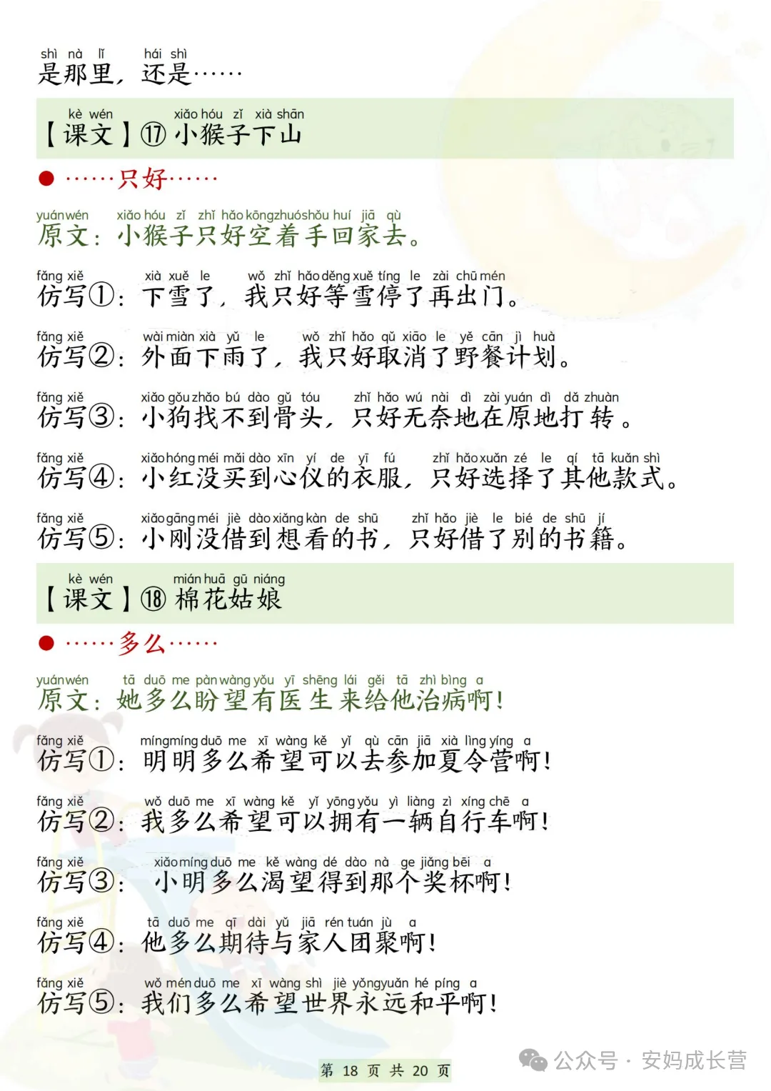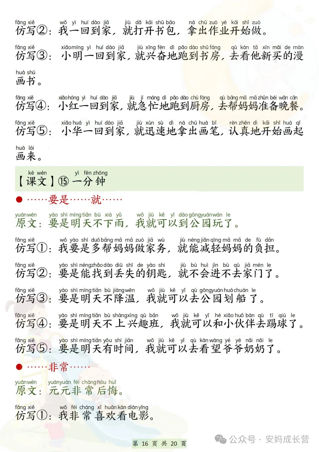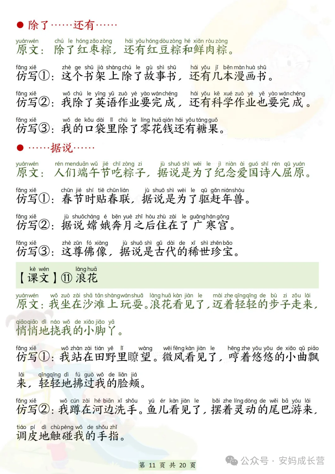 26年人教版一年级下册语文《每课仿写句子汇总》,共20页,电子版可下载可打印,这份一下语文仿写句子,涵盖了每篇课文的仿写例句,通过这些优秀的仿照例句,帮助孩子掌握各种句式结构,积累丰富的写作素材,提升孩子的语言表达能力。需要的家长抓紧给孩子准备上一份,让孩子背一背吧。