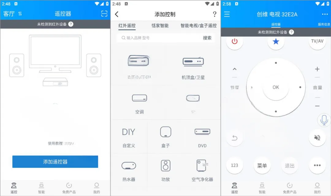 DIY 自定义遥控器支持红外学习功能,可录制原装遥控器按键,自定义添加按摩椅、智能洁具、遥控玩具等设备,支持类型多达 1155 种。
