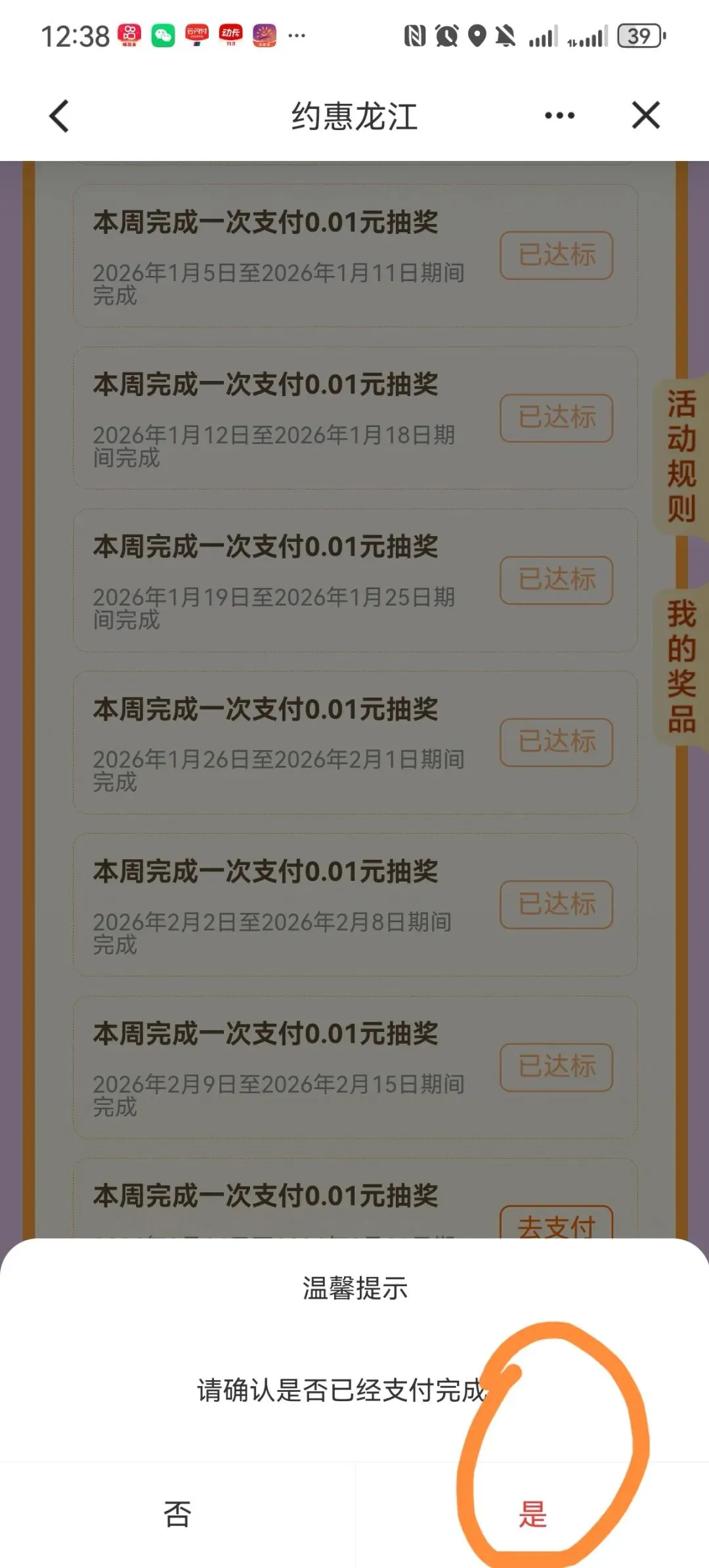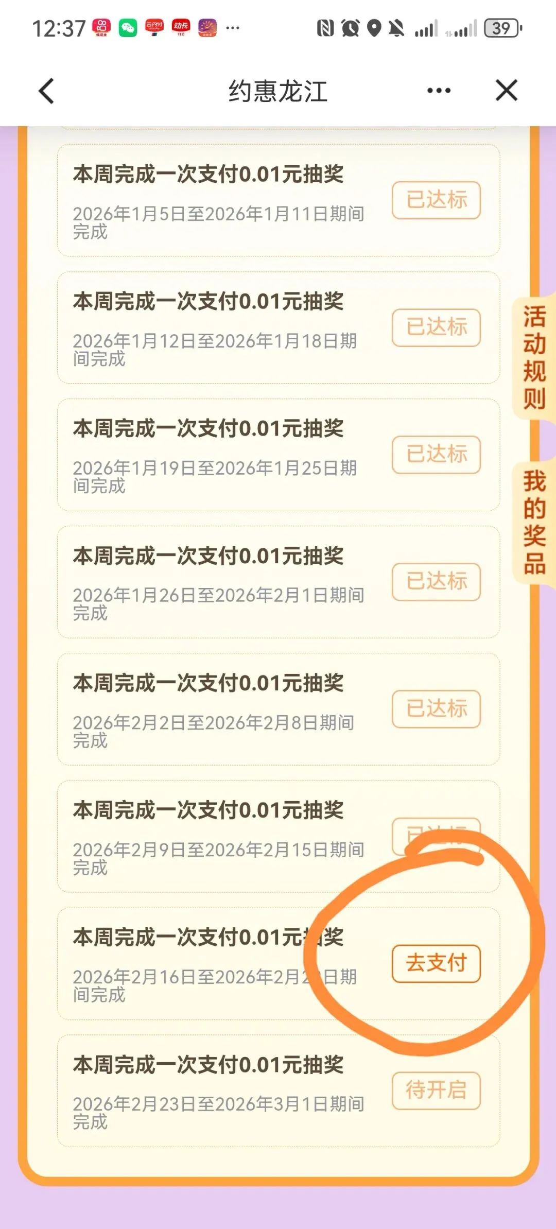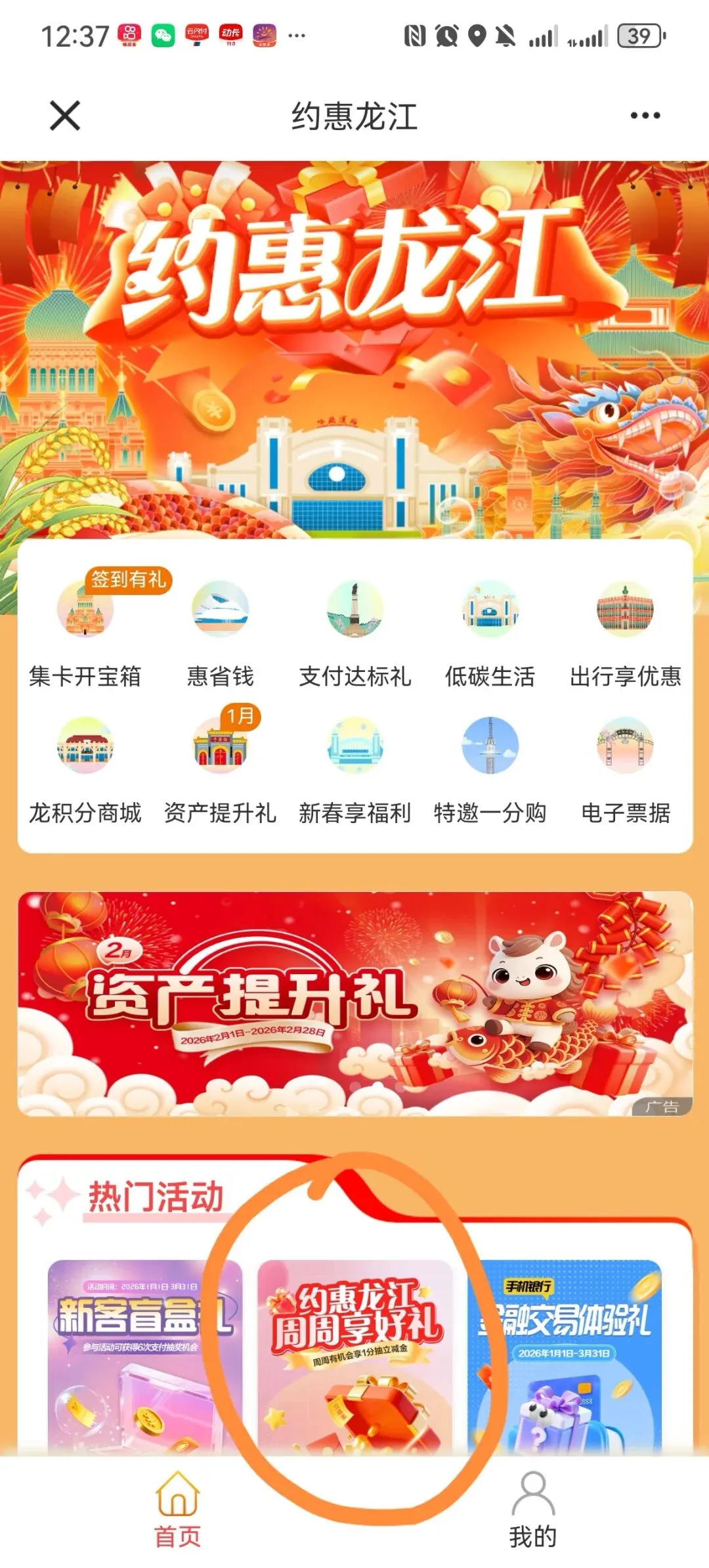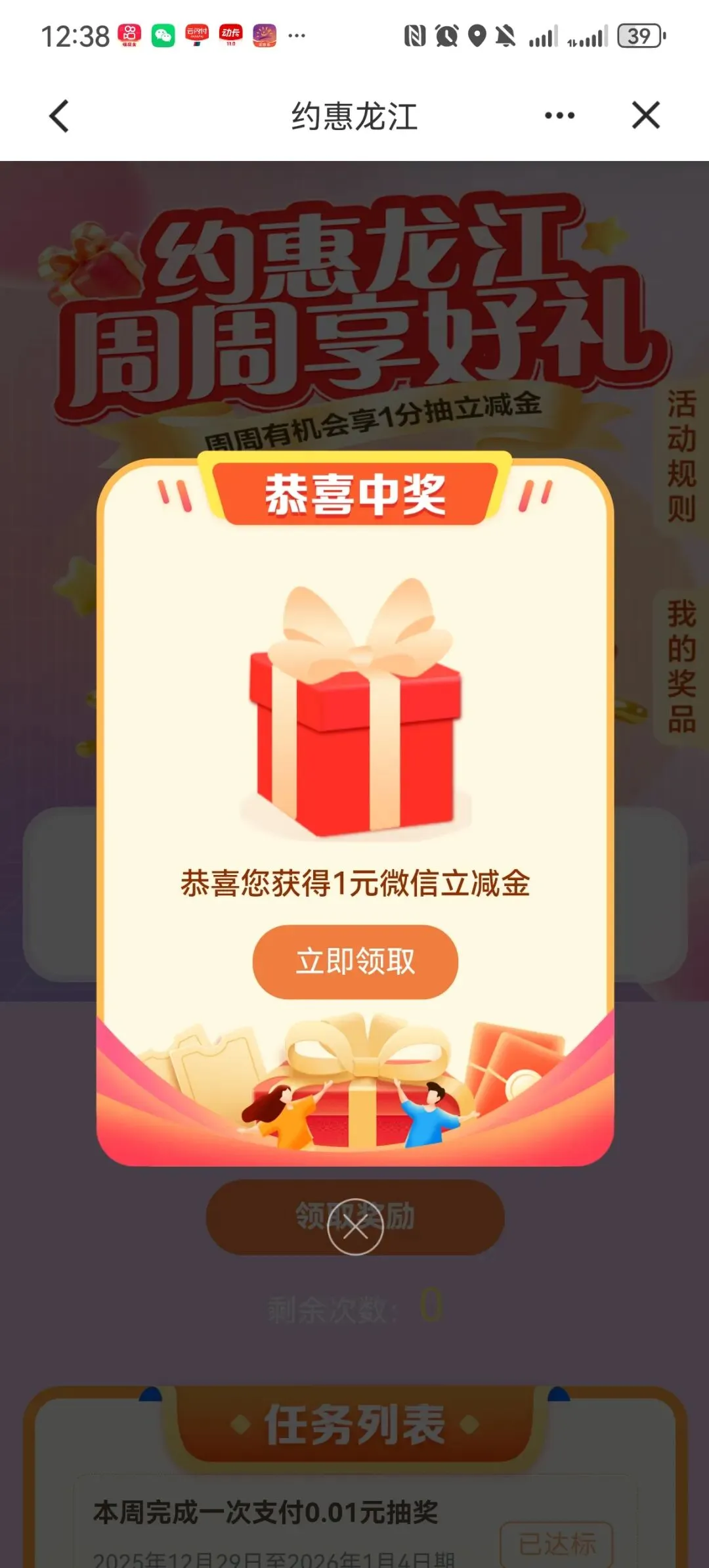 建设银行APP,约惠龙江,周周享好礼支付1分钱抽微信立减金