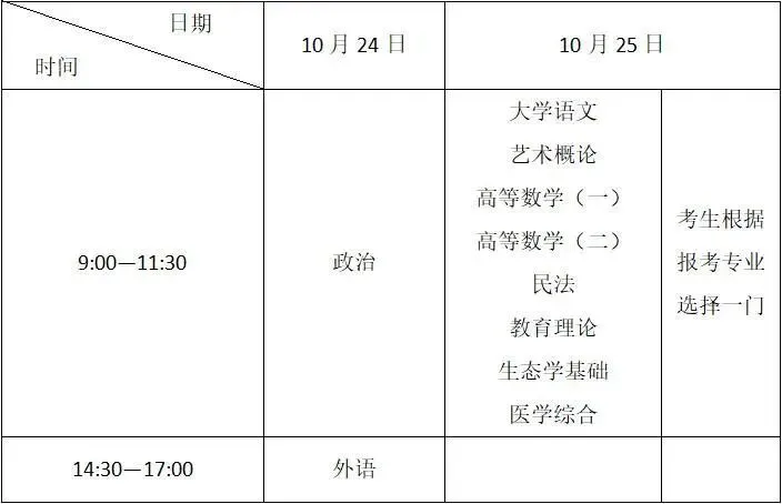 高起本和专科(高职)统考科目每门考试时间为120分钟,专升本每门考试时间为150分钟。具体安排如下:
