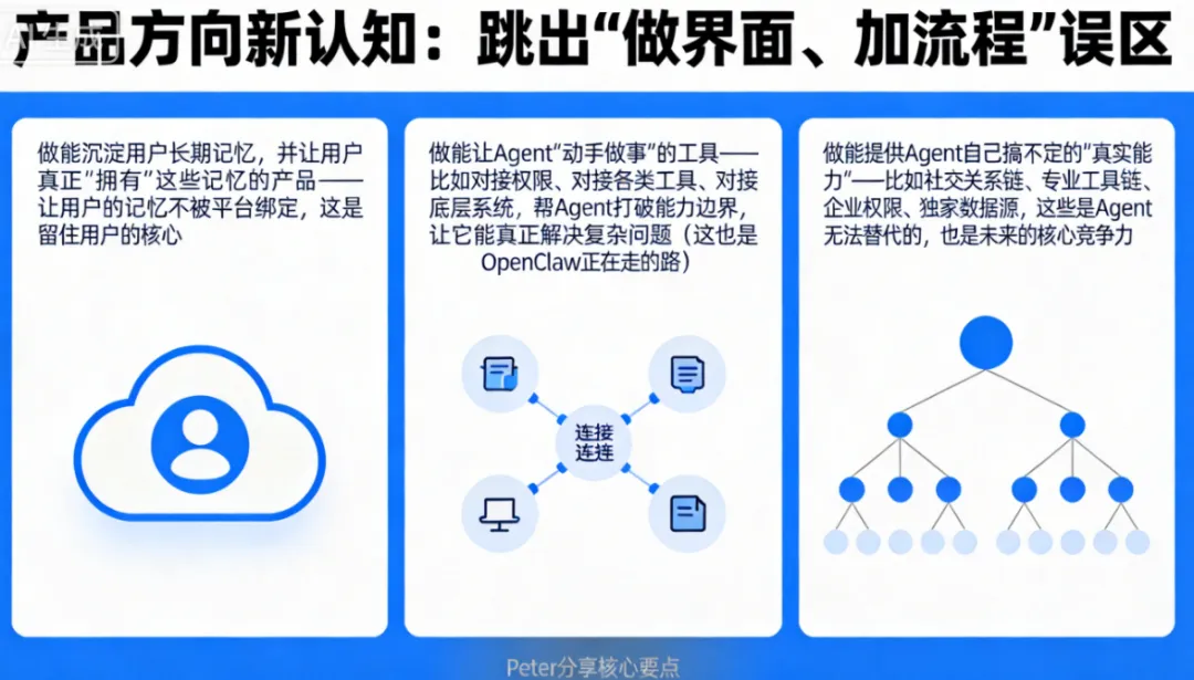 不管你是创业者、产品人,还是想抓住风口的普通人,都不要再陷入“做界面、加流程”的误区。Peter的分享给我们指明了三个方向: