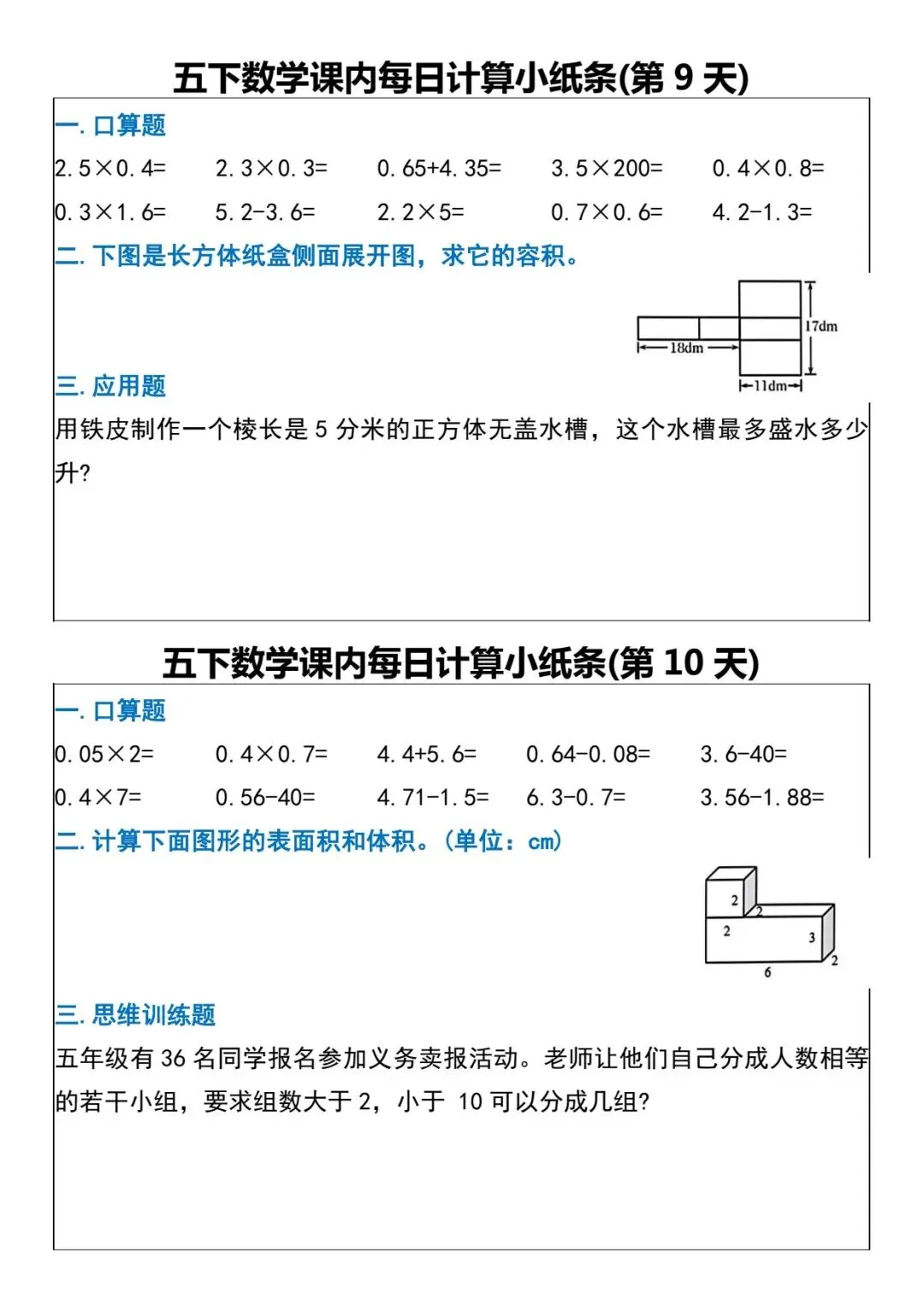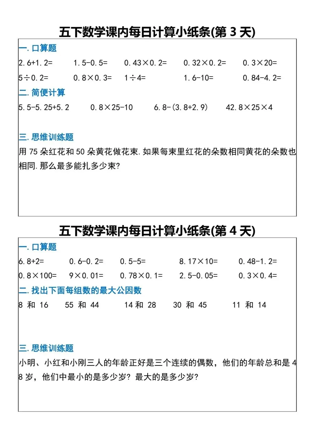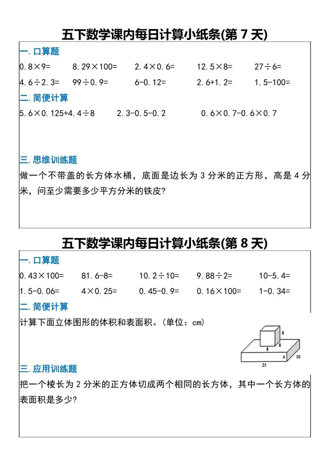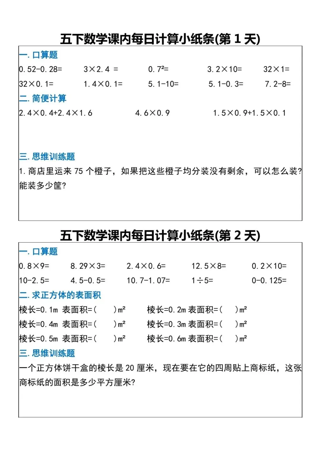 数学五年级下册《每日计算小纸条》(可下载打印)