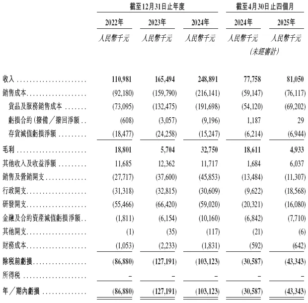 招股书显示,在过去的2023年、2024年和2025年前四个月,哥瑞利软件的营业收入分别为人民币1.11亿、1.65亿和2.49亿元,相应的净亏损分别为人民币0.87亿、1.27亿和0.43亿元。