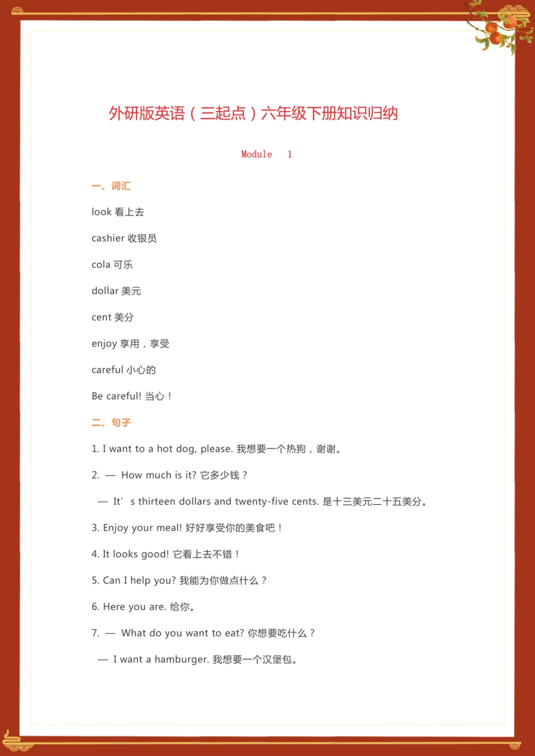外研版六年级下册英语全册重要知识点总结 电子版可下载