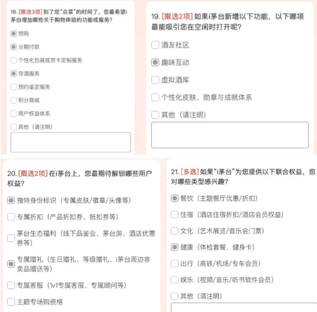 今日上午9时,提前预告的i茅台春节问卷抽奖活动开启。全卷23道题,除了年龄、住地等常规问题外,几个问题引起了C Four的留意,还专门截图了↓