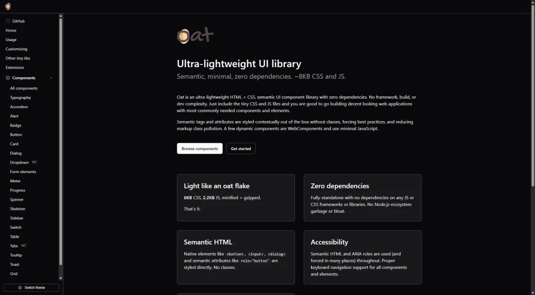 6.Oat:小身材,大能量——零依赖语义化UI库,极速构建你的Web应用 (Oat – Ultra-lightweight, zero dependency, semantic HTML, CSS, JS UI library)
