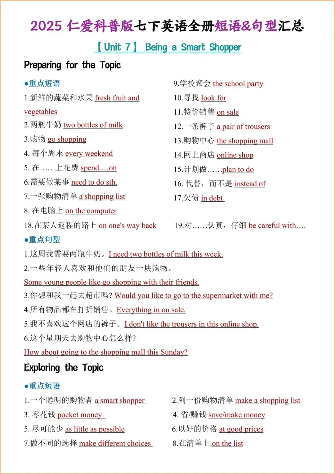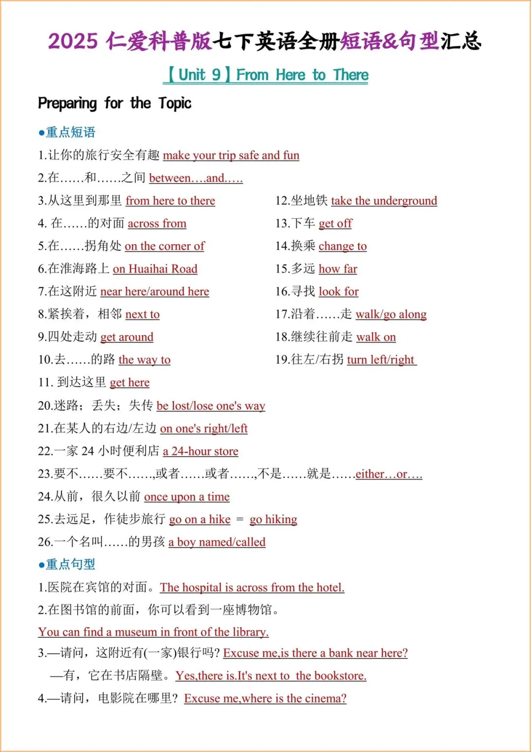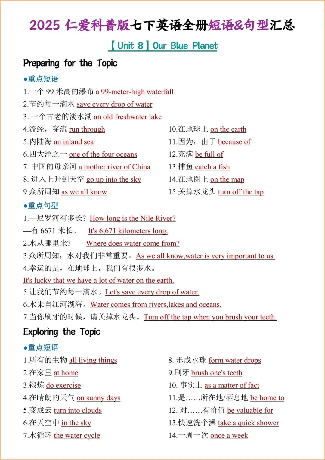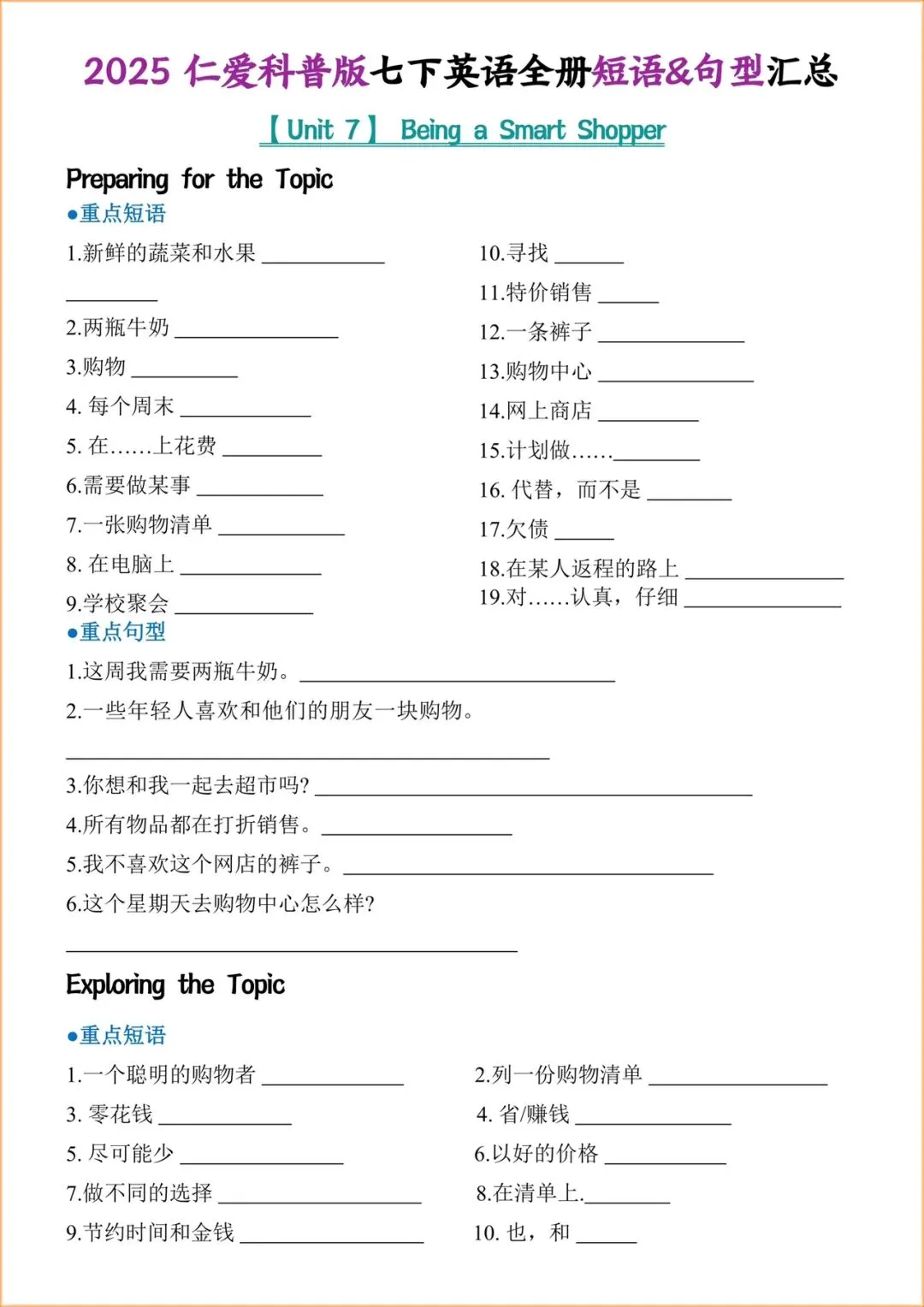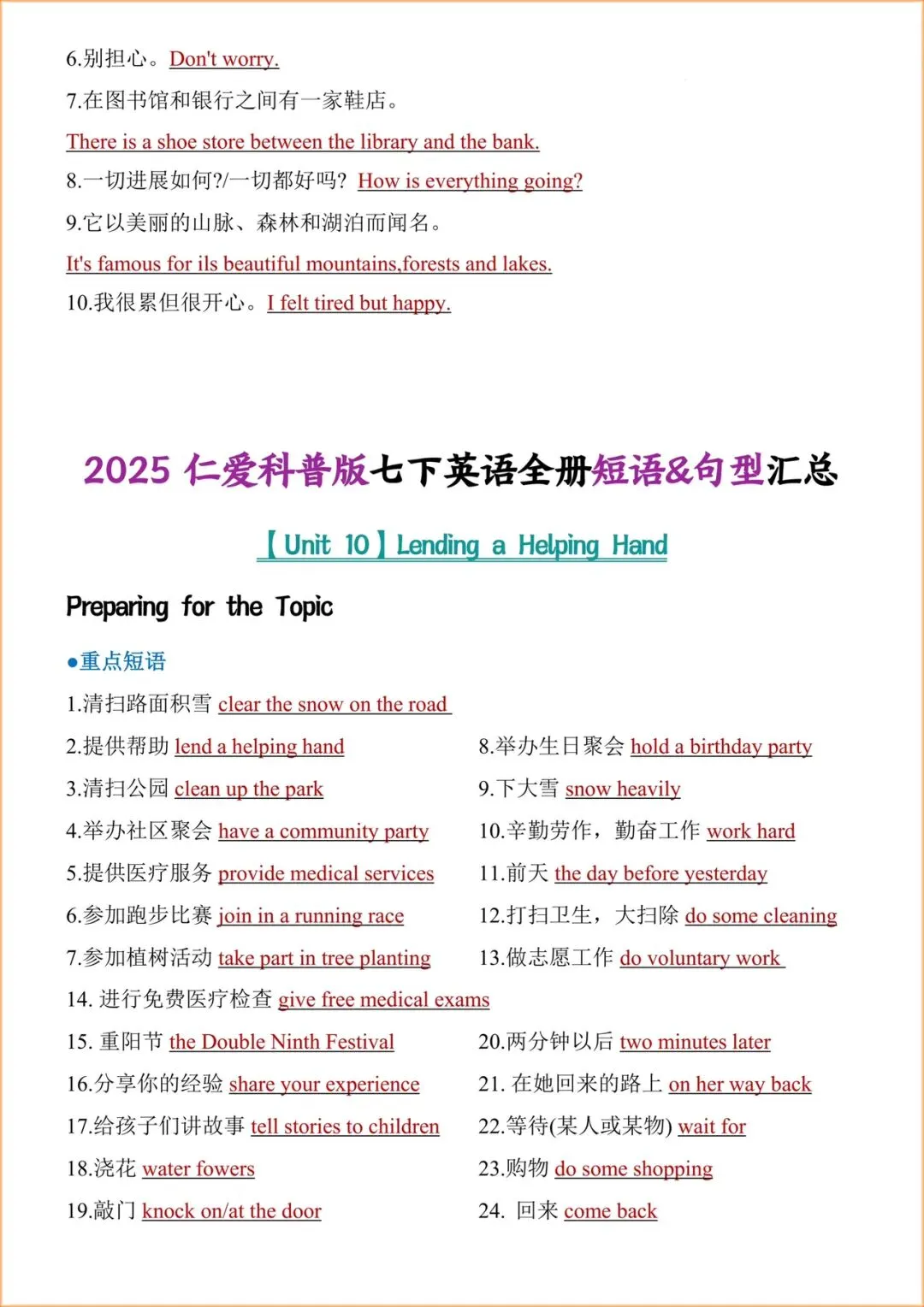 2026春新(仁爱版)七年级下册英语全册短语、句型汇总(背诵版+默写版)电子版可打印!