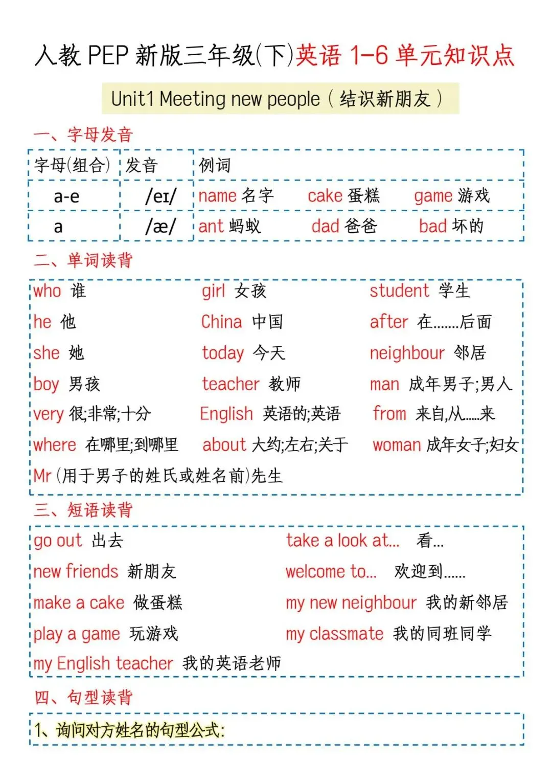 26年春新版三年级下册人教PEP版英语单元知识点总结,共11页,电子版可下载可打印,这份三下人教pep版英语单元知识点汇总,涵盖了每个单元的重点单词、重点句型、重点语法等内容,帮助孩子梳理所学重点内容,助力孩子的英语学习更高效。需要的家长抓紧打印出来,让孩子读一读、背一背吧。