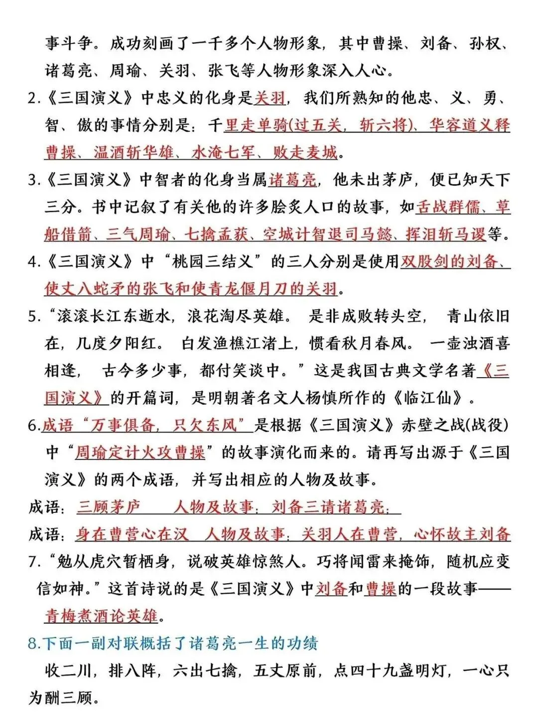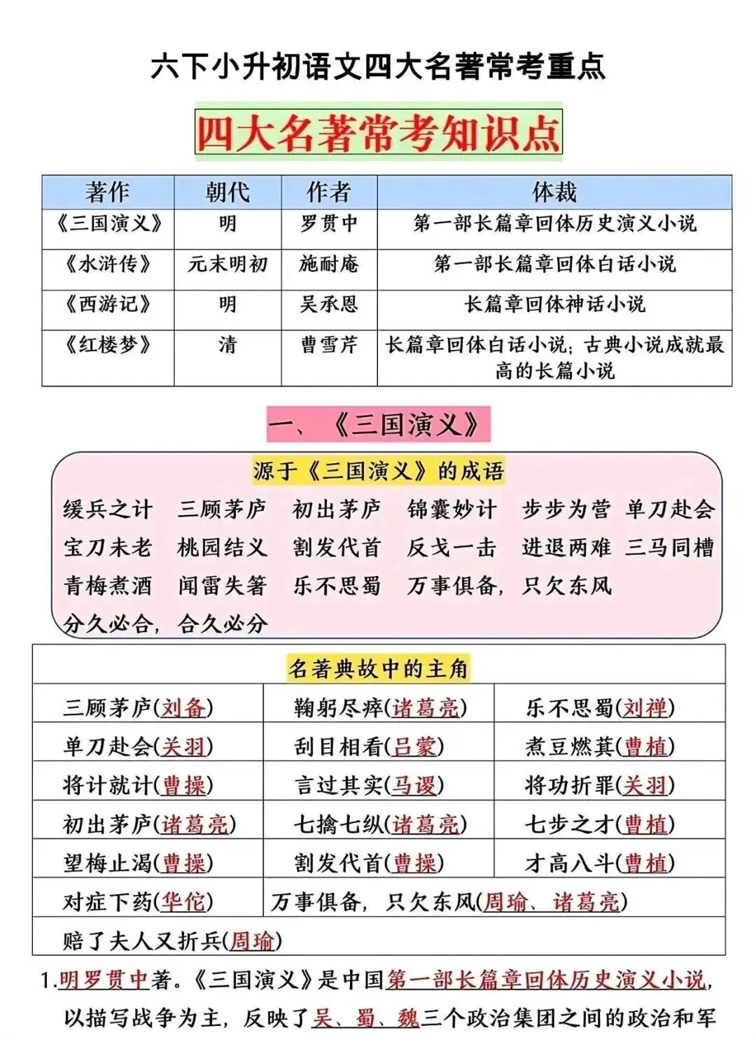今天给大家分享的是六下语文小升初四大名著常考重点,精准贴合小升初考情,全面梳理西游、三国、水浒、红楼四部名著的核心考点,从作者朝代、人物绰号、经典情节等基础识记内容,到填空、选择、简答等必考题型的答题要点,再到历年考试高频丢分的易错点,都进行了系统整合与清晰归纳。资料按备考优先级划分重点,剔除繁杂内容,只留考试核心,孩子不用再盲目翻读厚书,每天利用碎片时间记一点,就能吃透考点、查漏补缺,轻松拿下四大名著这类 “送分题”,为小升初语文备考筑牢基础,是六下孩子升学冲刺的必备干货。