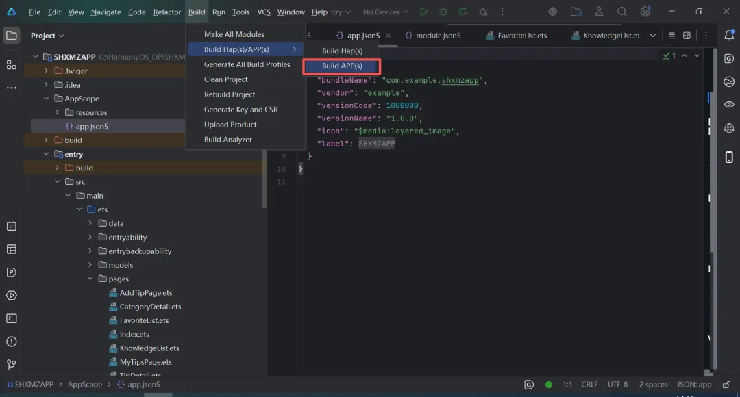 在cursor把程序帮我们编写完成使用DevEco Studio编辑调试程序的时候,我们需要先编译程序,点击Build->Build Hap(s)/APP(s)->Build APP(s)。点击完,该软件会自动编译cursor编写的程序。