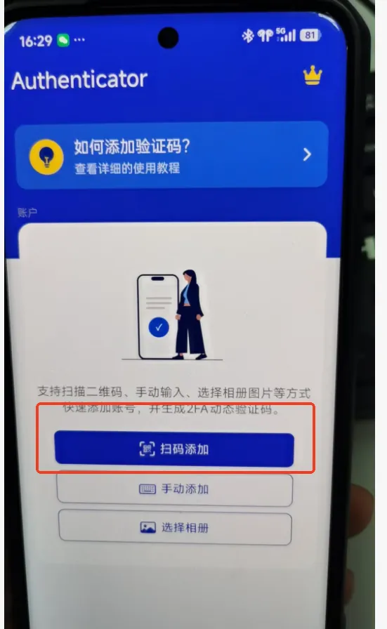 8、新界面,用手机APP(Authenticator)扫码添加,扫码后,官网点击下一步,输入手机上实时更新的验证码