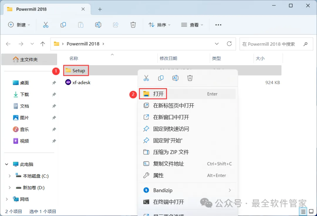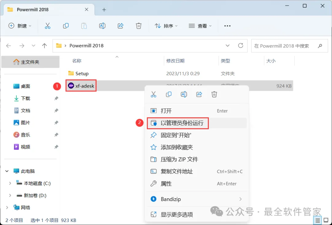 20、回到PowerMill 2018文件夹,找到【xf-adesk】程序,右键选择【以管理员身份运行】它