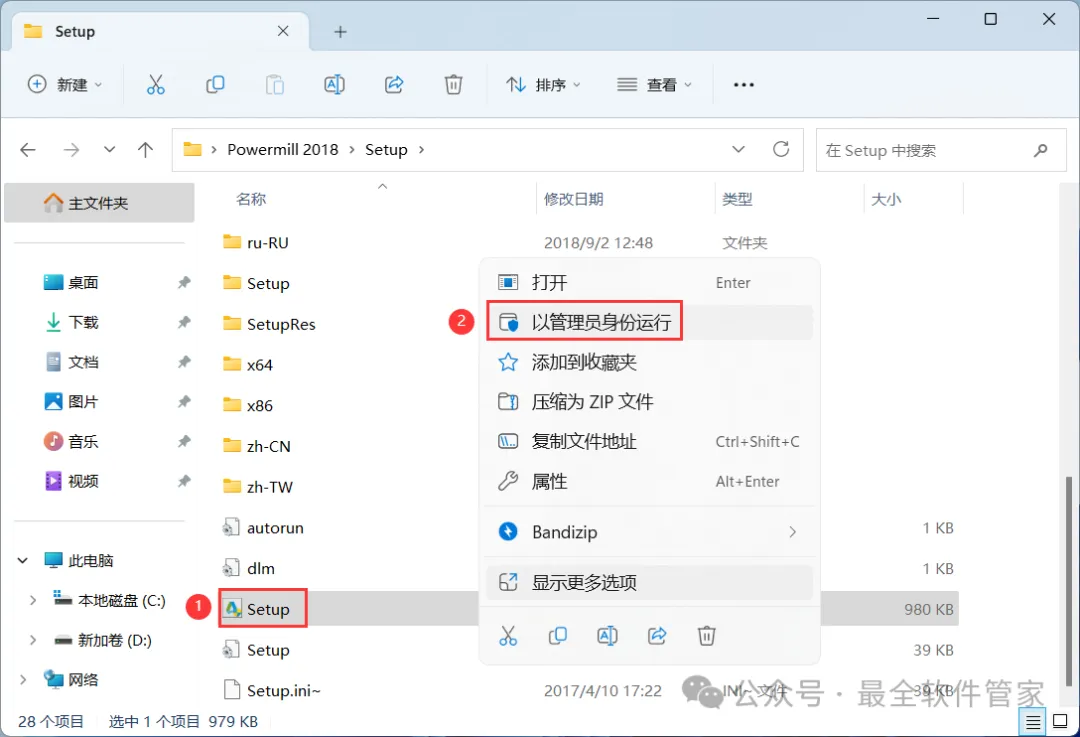 4、找到【Setup】应用程序,右键选择【以管理员身份运行】它