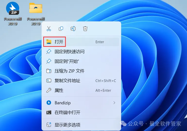10、回到桌面,右键桌面上的【PowerMill 2019软件图标】,点击【打开】