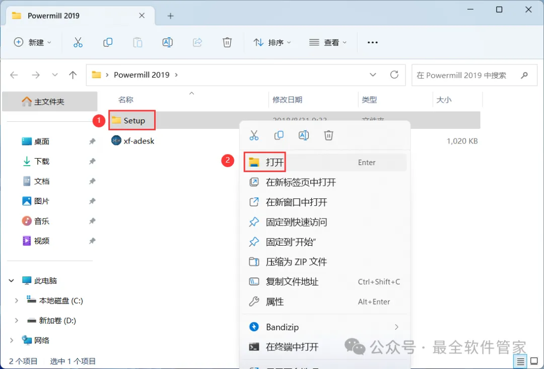 20、回到PowerMill 2019文件夹,找到【xf-adesk】程序,右键选择【以管理员身份运行】它