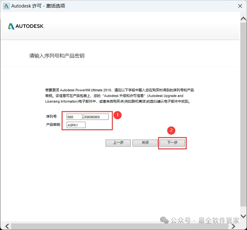 15、序列号输入:666-69696969,产品密钥输入:A9PK1,再点击【下一步】