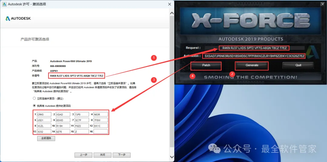 21、打开软件界面,将软件的【申请号】填入到程序的【Requset】内,再点击【Generate】,将程序的【Activation】填入到软件的【激活码】内,再点击【Patch】