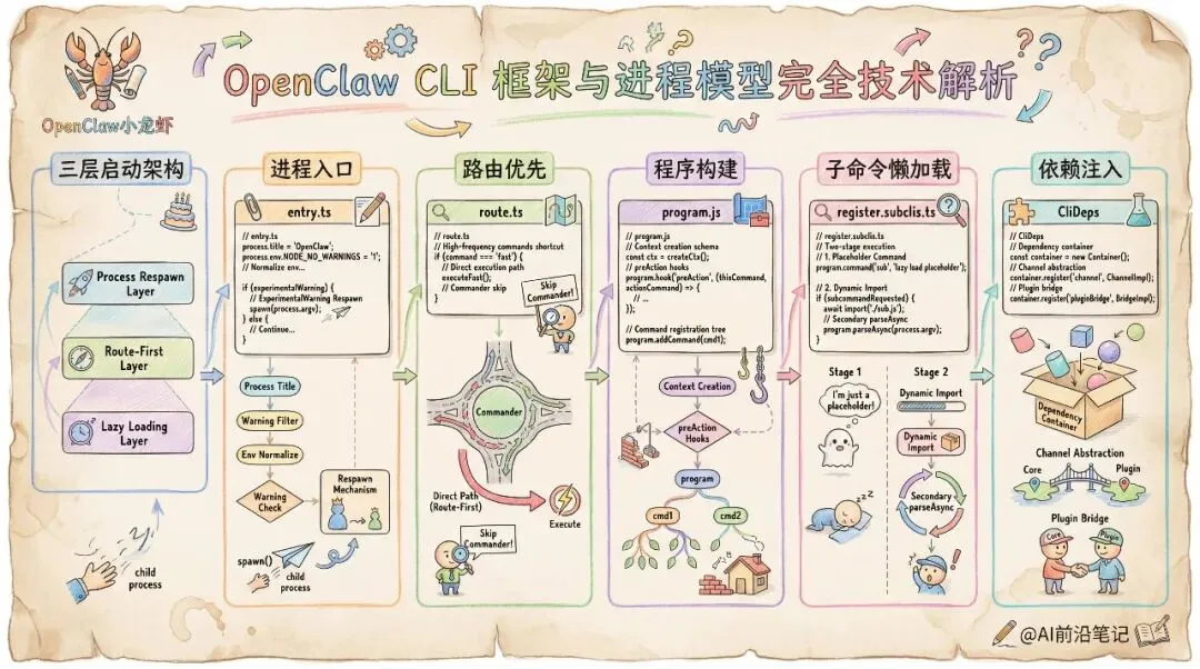 OpenClaw 的 CLI 承载了 40+ 个子命令(gateway、agent、channels、plugins…),但冷启动时必须足够快。为此,项目设计了一套三层启动架构:进程 Respawn → 路由优先 → 子命令懒加载。本文从第一行代码开始,逐层拆解。