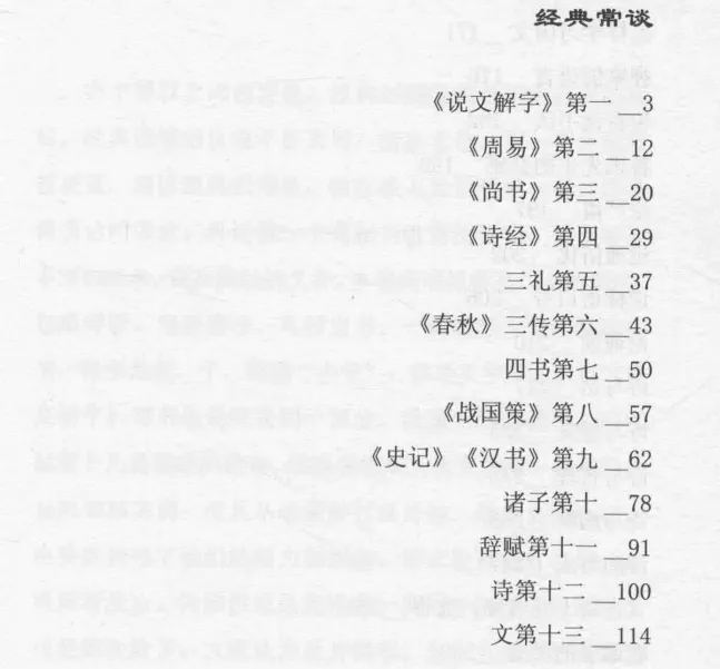 内容与结构:13篇。采用逻辑顺序:从文字(《说文解字》)到思想(经部诸书)到历史(史部诸书)再到文学(诗、文等概述)。
