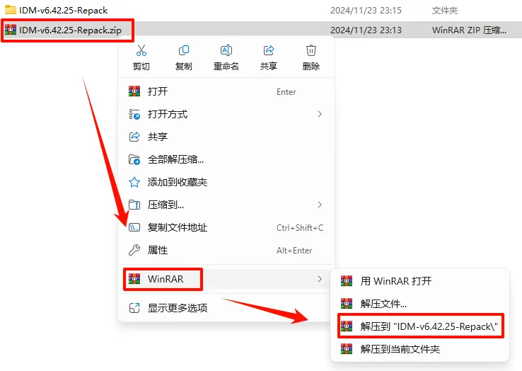 1.选中下载的压缩包,然后鼠标右键选择解压到”IDM_v6.39.8_Repack”(没有解压选项点这里)