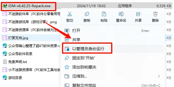 2.打开刚刚解压的文件夹,选中“IDM-v6.42.25-Repack.exe”文件,鼠标右键点击“以管理员身份运行”