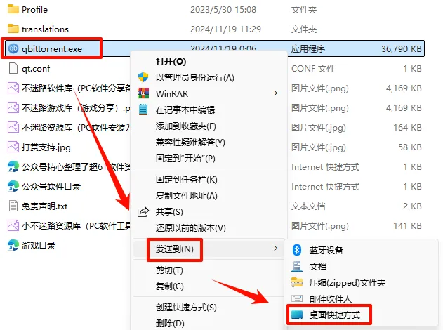 2.打开刚刚解压的文件夹,鼠标右键点击“qbittorrent.exe“选择“发送到——桌面快捷方式“