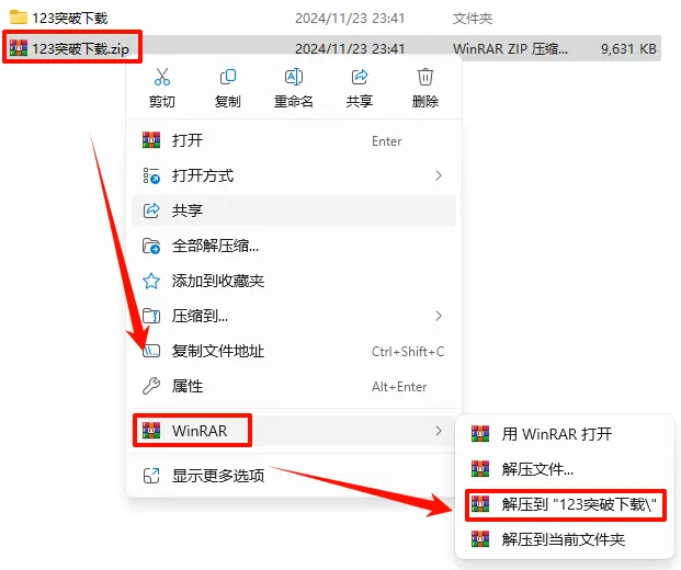 1.选中下载的压缩包,然后鼠标右键选择解压到“123突破下载”(没有解压选项点这里)