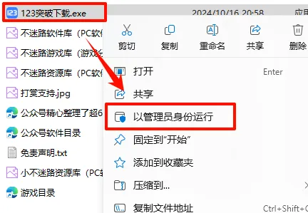 2.打开刚刚解压的文件夹,选中“123突破下载.exe“文件,鼠标右键点击“以管理员身份运行”