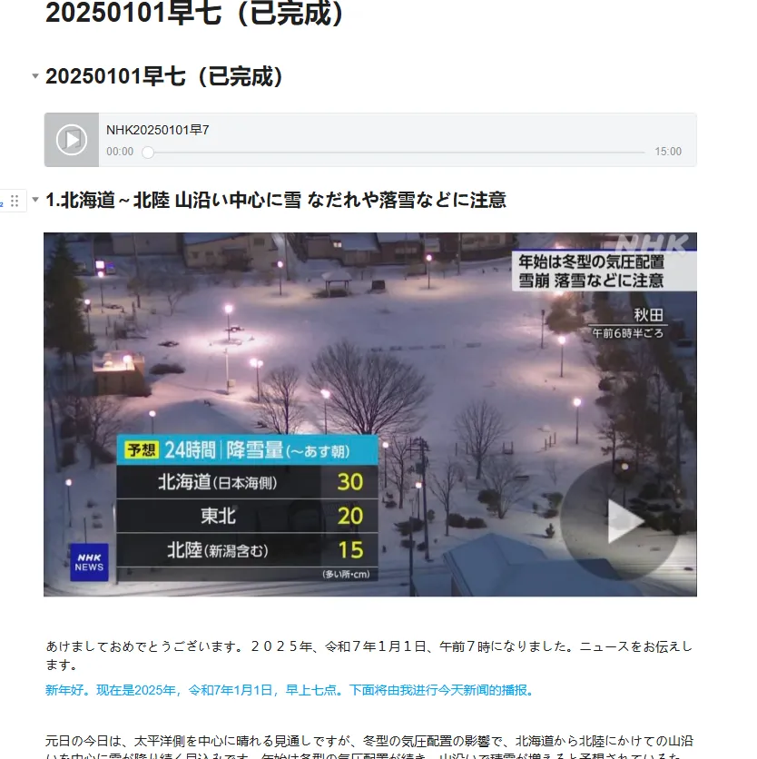 学日语的小伙伴们,我们做NHK日语早7点听译多年啦,雷打不动 坚持日更,后来抵不住有人盗用我们文稿售卖 ,干脆把NHK双语版更新在【猩听译】APP里 只在公众号更日文版NHK早7点。但猩听译APP因为下载、更新的内容、以及一些APP使用功能问题,不能满足所有用户需求, 有不少用户希望只看【NHK日语早7点】的双语版+音频。 经过斟酌,最后我们把【NHK日语早7点】的双语版+日语音频汇总到一个线上文档链接里,给需要的宝子们整理好了。 敲重点:一个文档可以活动全年的NHK日语早7点新闻,包含中日双语文档,和在线同步音频,以及对应的新闻图片! 更具体请看下文 此素材包含哪些内容? 1.2026年全年NHK日语早7点新闻素材,中日 双语对照+日语音频 2.更新频率:日更,基本最晚第二天更新前一天 的素材 3.使用期限:2年有效期 4.查看方式:腾讯文档 购买此素材注意点 1.本商品是电子文档 下单后发送腾讯文档链 接 2.购买用户有查看权限,可以一边听音频一边 查看NHK早7点中日双语素材,但是文本不可复制 不可导出打印 介意勿拍 (图例展示) 3.文档同时配有每篇新闻里小主体的图片,更直观 4.此素材我们都听译和校对过,但不保证100%无 错误,可能也有小错误,如有错误可以反馈指正, 我们会及时做修改 但不以这个原因做售后退款 请 知晓 5.使用期限是2年,足够大家学习的啦,基本第二年 又开始学当年的心素材啦。相当于一天才0.2元 性价比超高。 6.尤其有些公众号里敏感的新闻,一些原文和译文我们也会放在付费文档里(太敏感的不会放,会被和谐,请知晓) 学习此素材有什么好处? 1.NHK日语早7点素材是日更素材,每天都