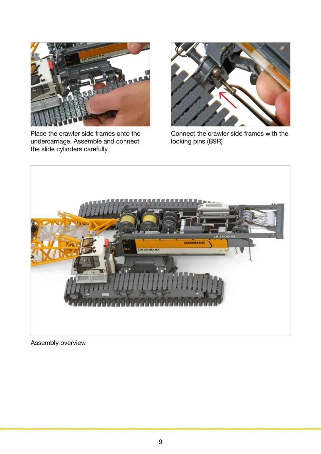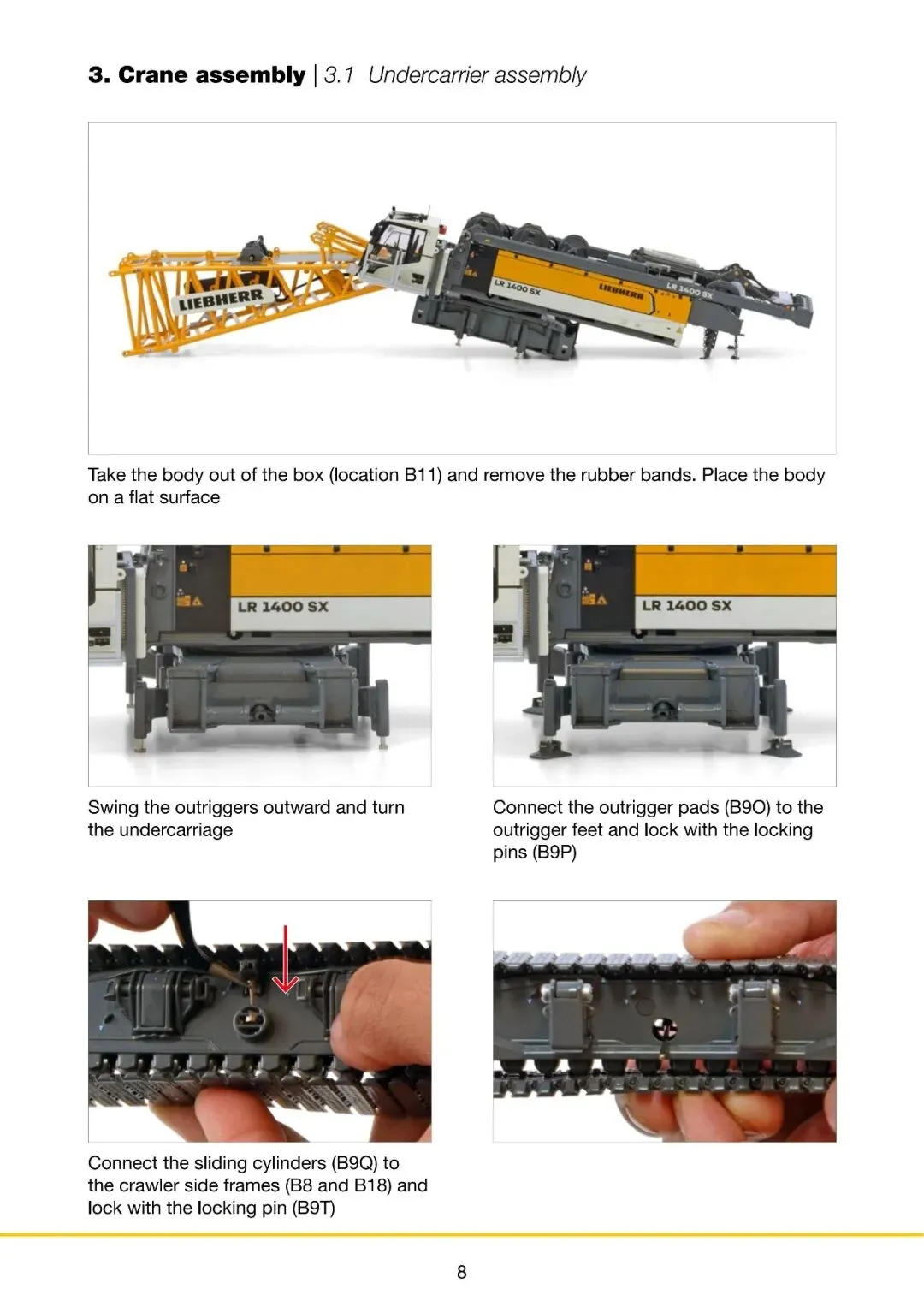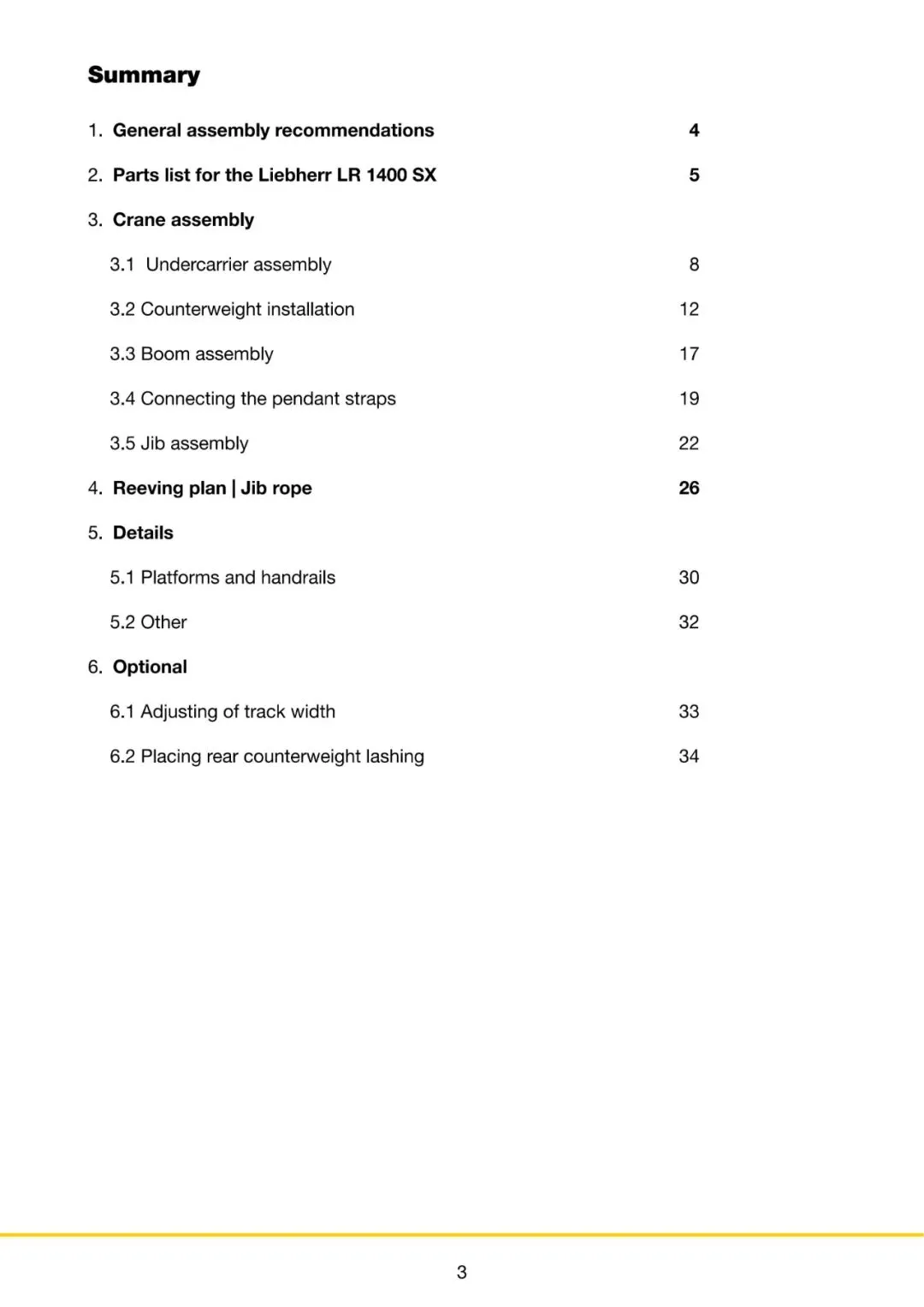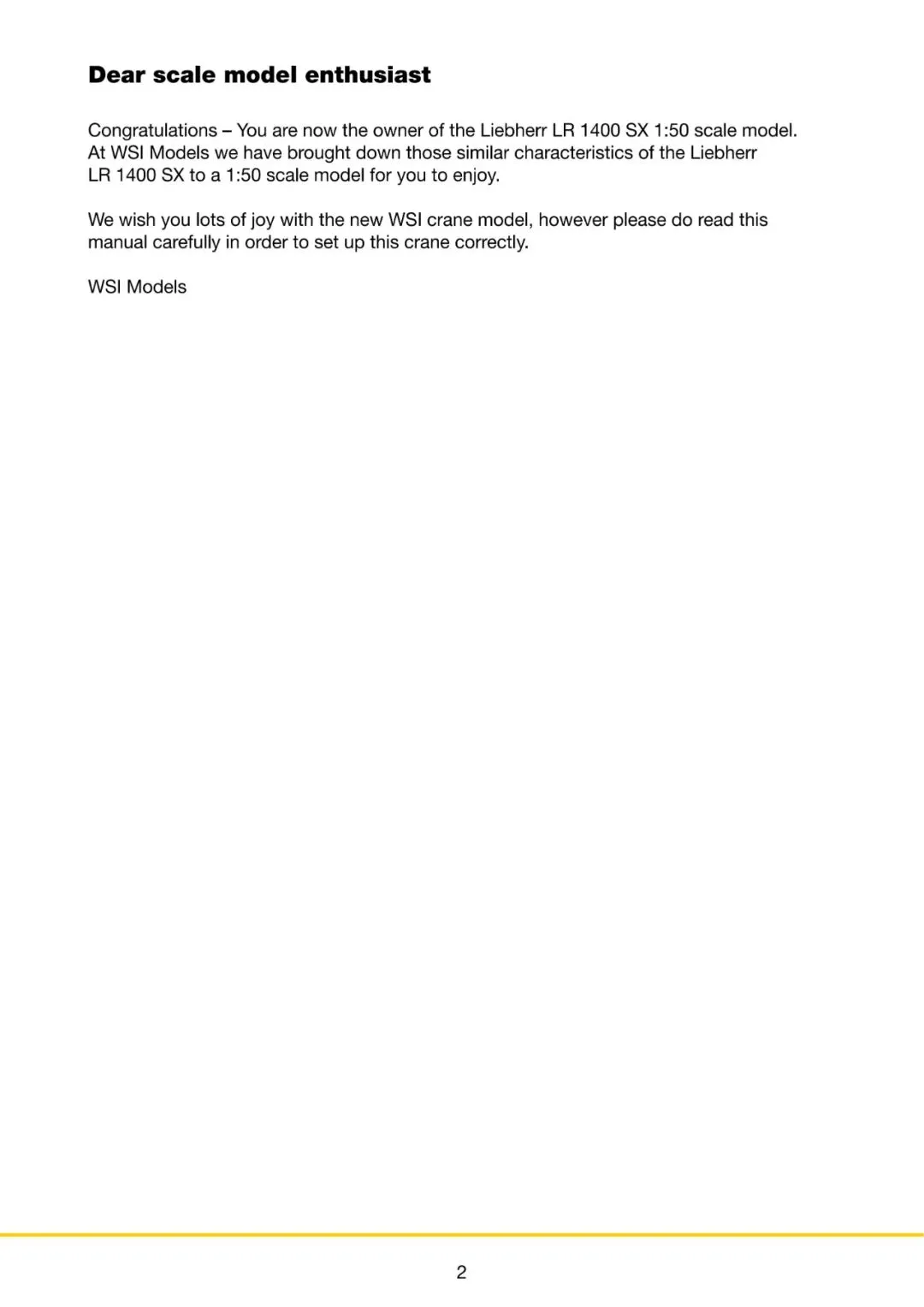 亲爱的比例模型爱好者: 恭喜您现在是利勃海尔LR1400 SX 1:50比例模型的所有者。在WSI模型中,我们降低了利勃海尔的那些相似特征。LR1400 SX为 1:50比例模型,供您欣赏。 我们祝您对新的WSI起重机模型充满喜悦,但请仔细阅读本手册,以便正确设置此起重机。 说明书摘要,以便直达操作说明。