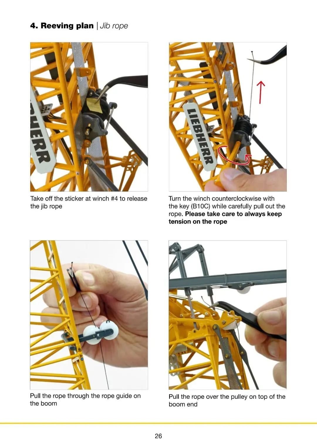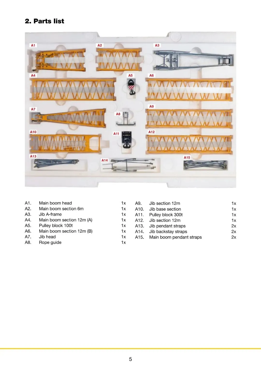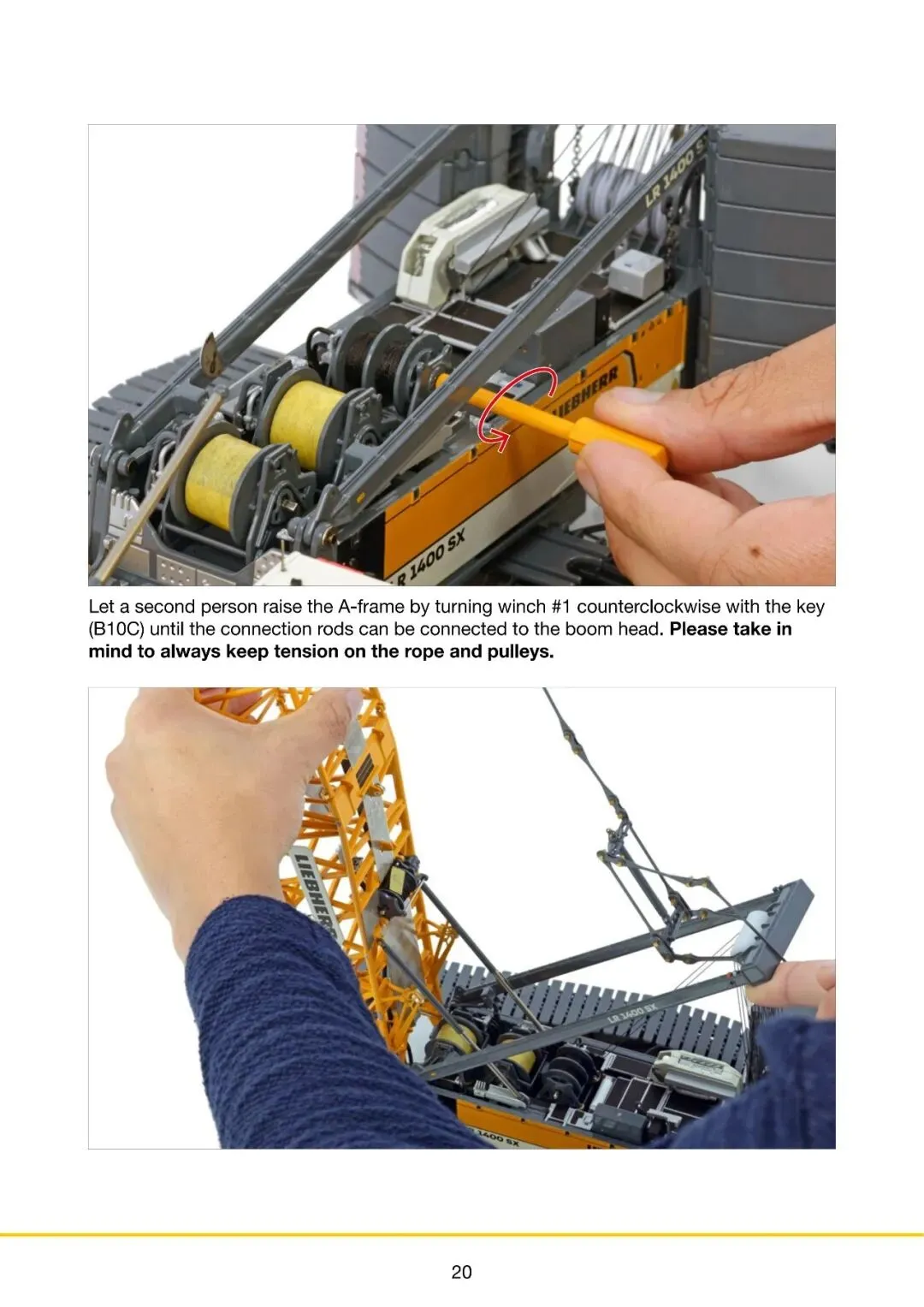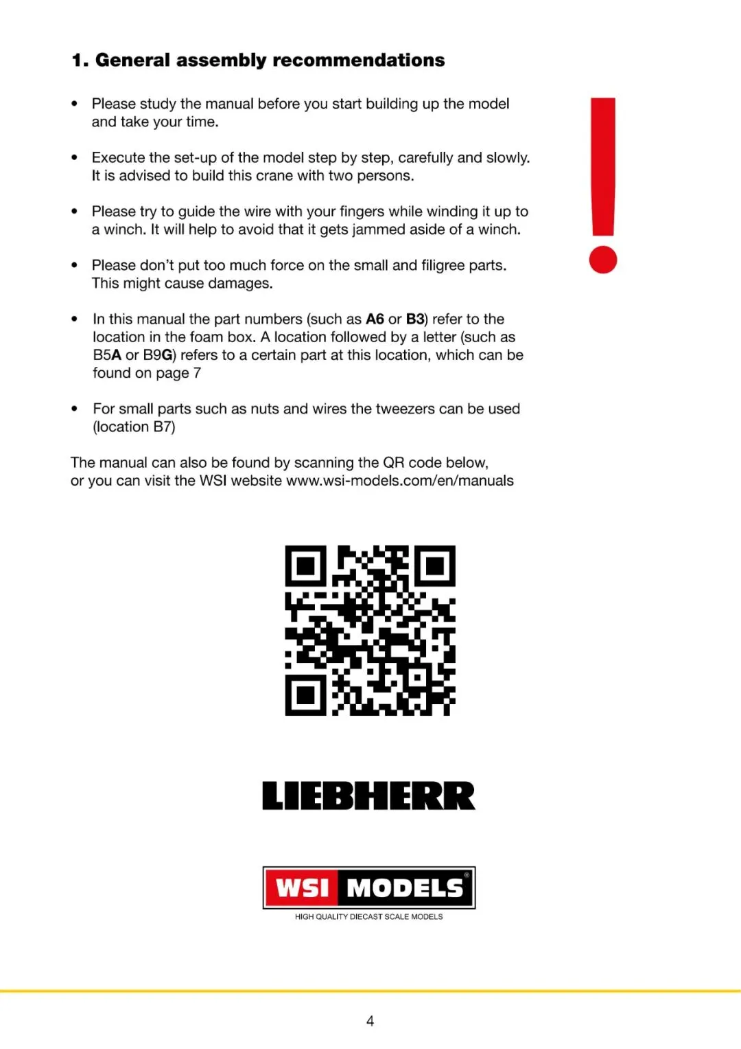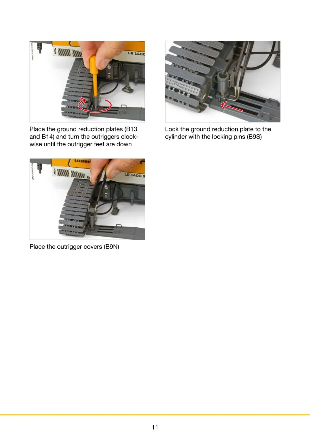 亲爱的比例模型爱好者: 恭喜您现在是利勃海尔LR1400 SX 1:50比例模型的所有者。在WSI模型中,我们降低了利勃海尔的那些相似特征。LR1400 SX为 1:50比例模型,供您欣赏。 我们祝您对新的WSI起重机模型充满喜悦,但请仔细阅读本手册,以便正确设置此起重机。 说明书摘要,以便直达操作说明。
